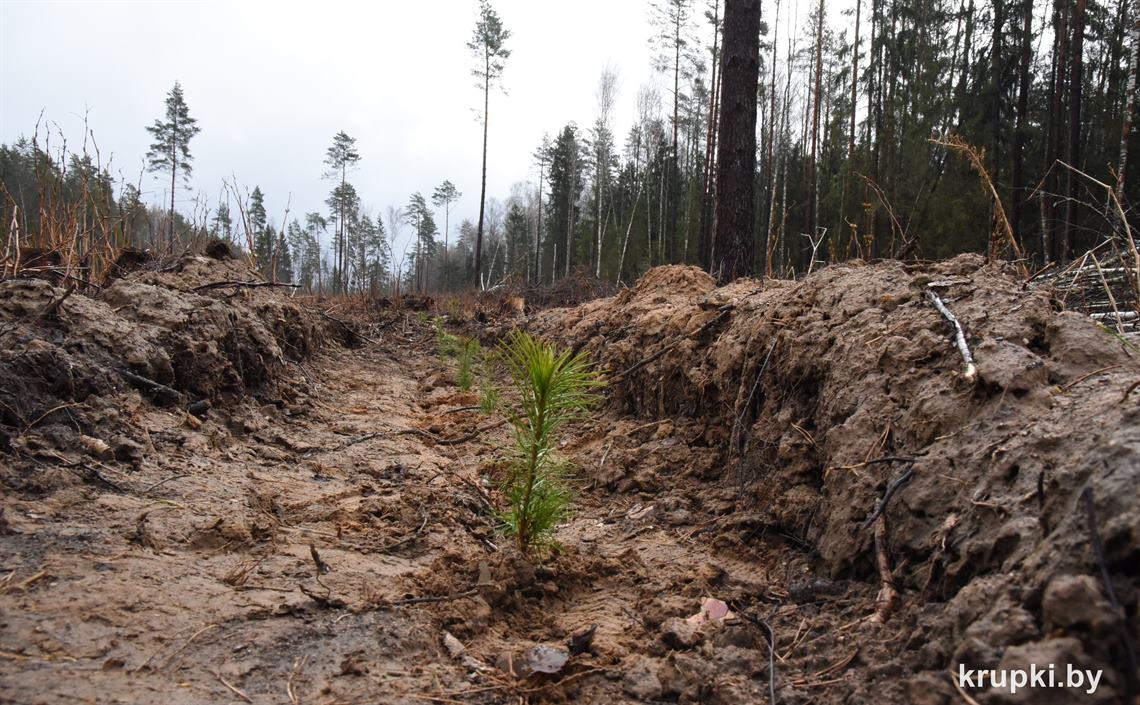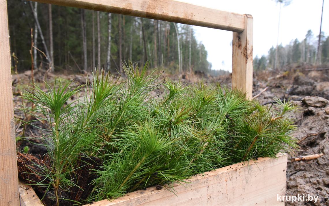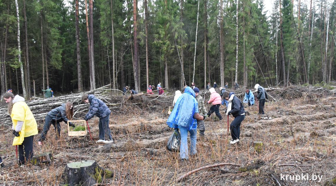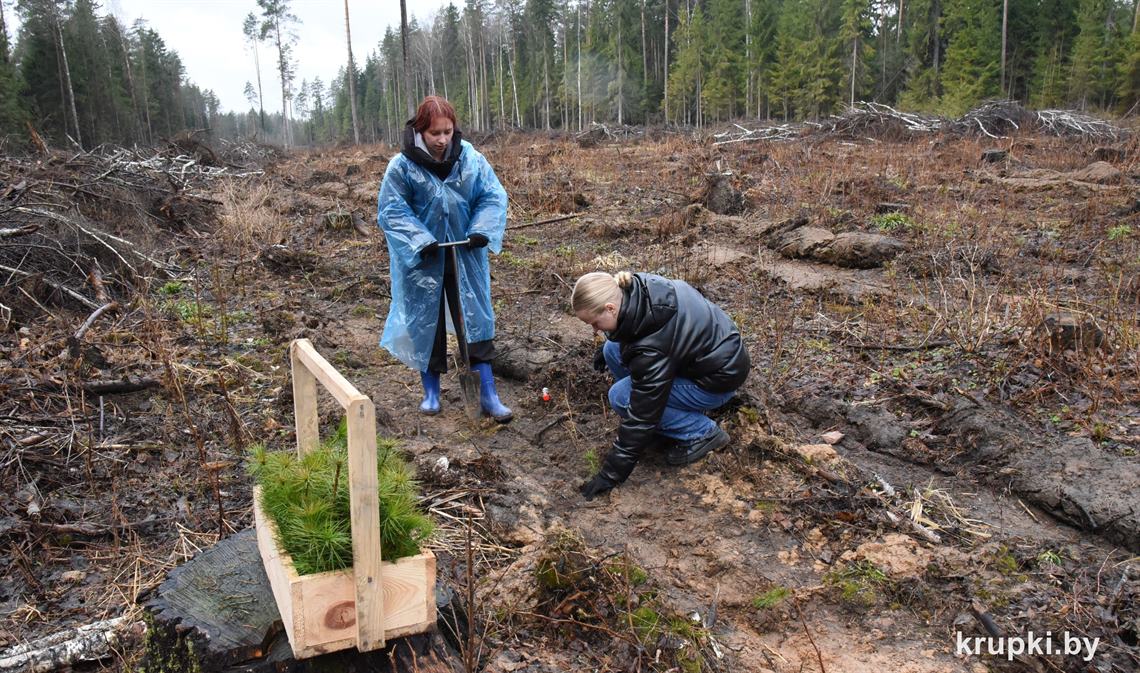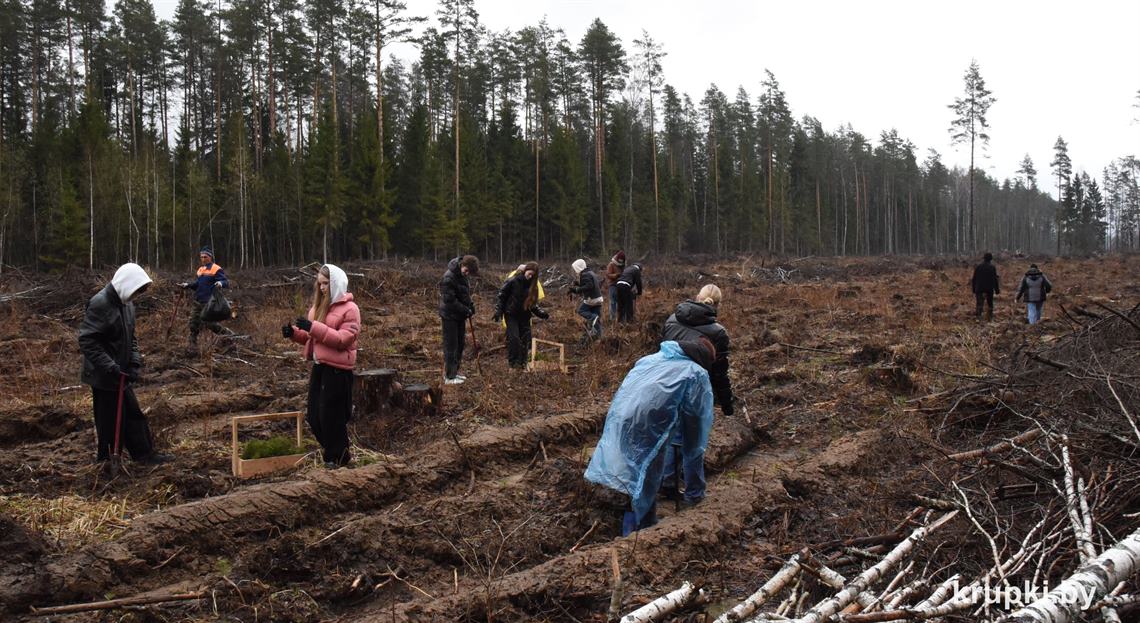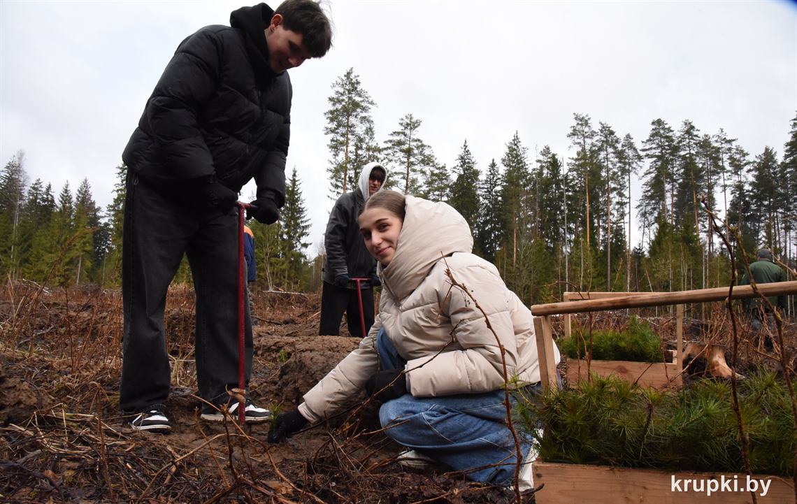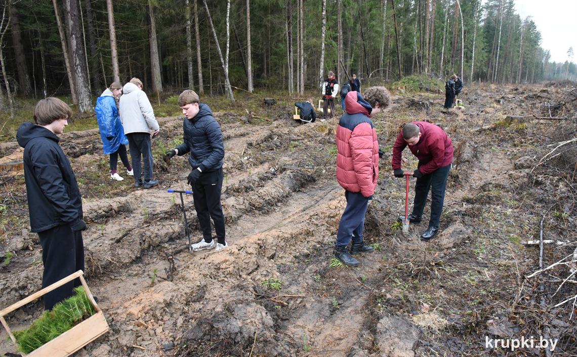 Ребята сажали сеянцы сосны и ели на делянке Крупского лесничества.