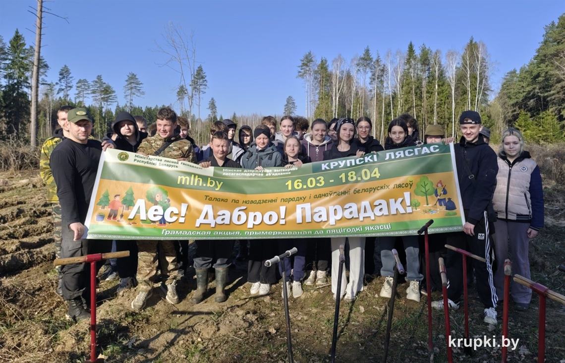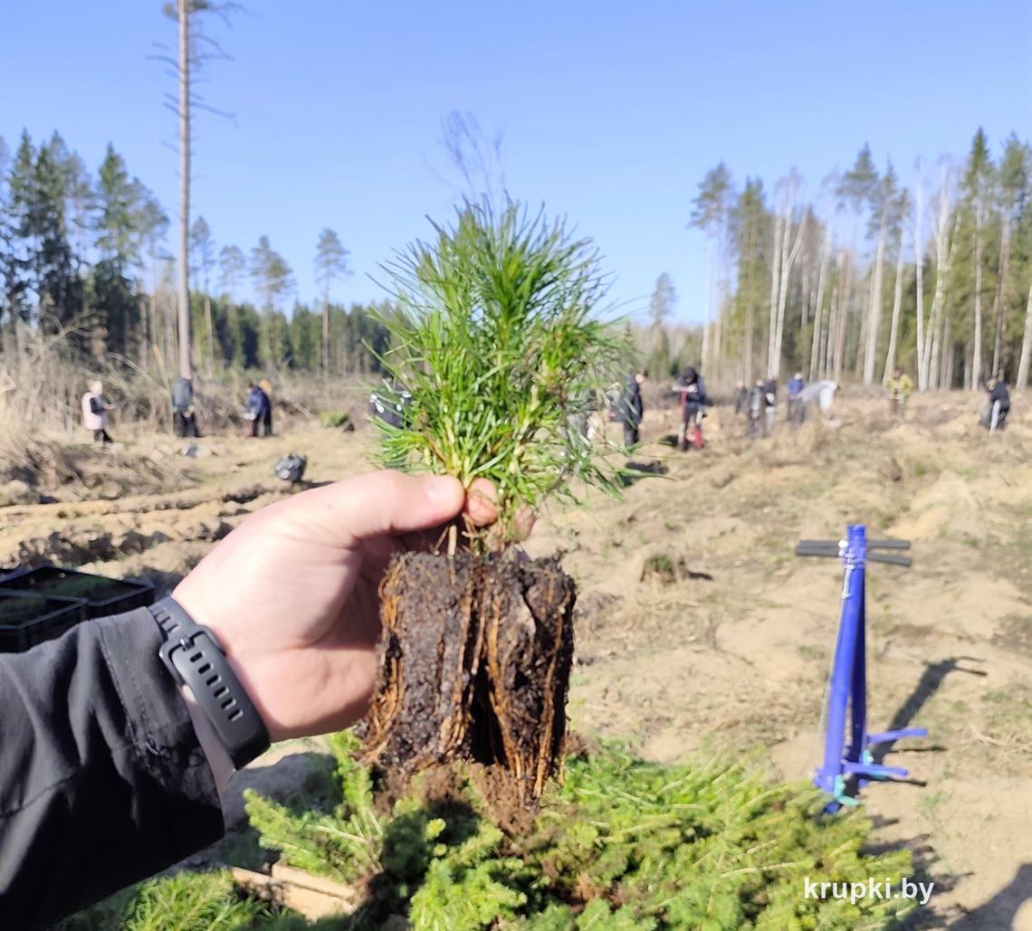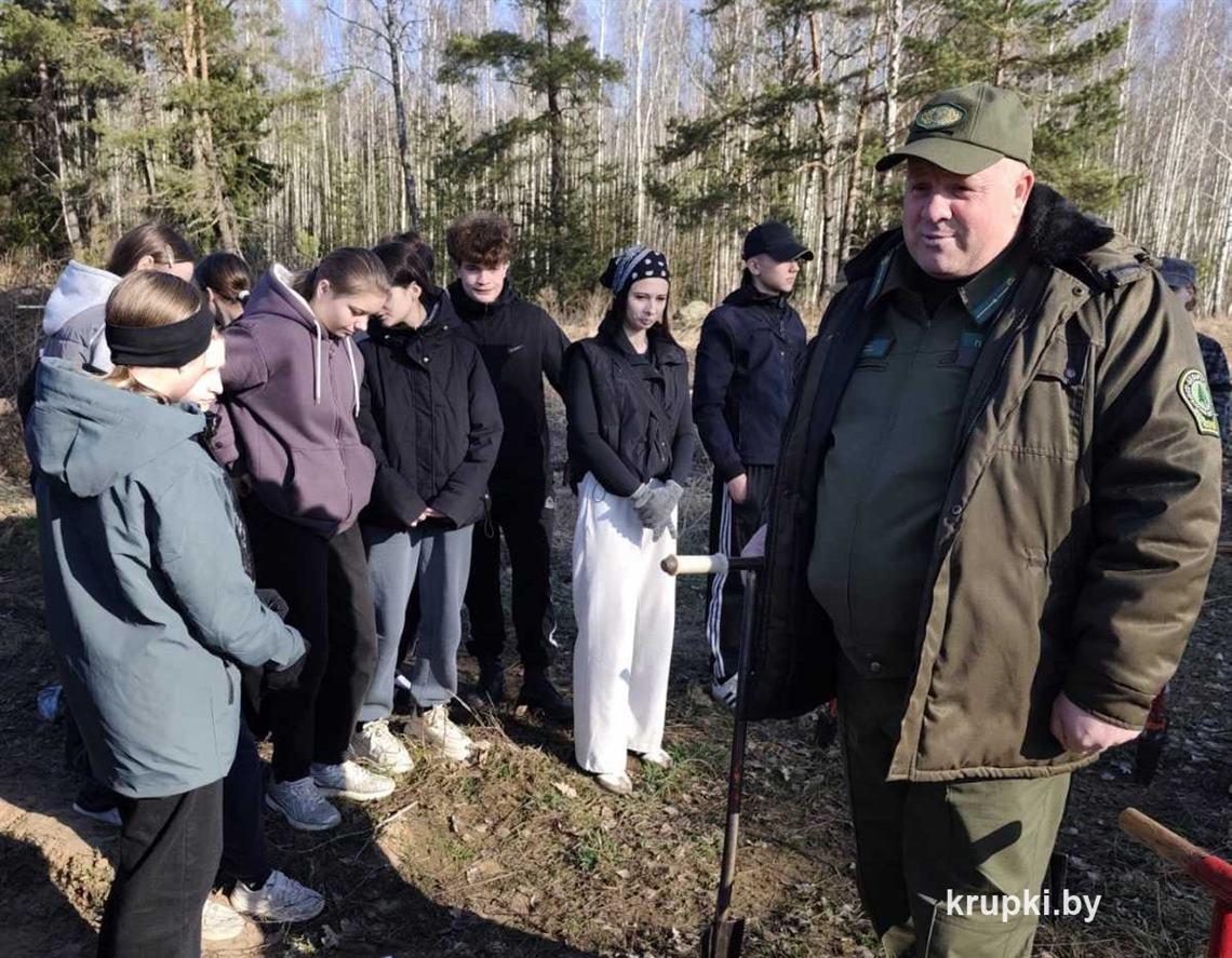 На делянке Крупского лесничества площадью 2,8 га высаживают молодые деревца по схеме: 8 рядов сосны, 2 ряда ели. Школьники с хорошим настроением взялись за работу.