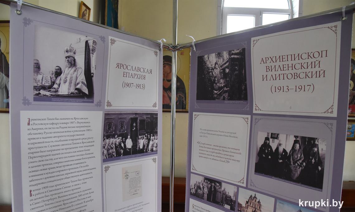 – Архипастырь Тихон славился своим добродушием, – рассказывает благочинный церковного округа протоиерей Георгий Тюхлов. – Каждый, кто приходил к нему, получал тепло. Для каждого у святителя Тихона находилось время для бесед. Он приезжал в отдаленные места, где редко совершались богослужения, чтобы объединить христиан. Во времена Первой Мировой войны Владыка посещал воинов в окопах, служил молебны. В период, когда Патриарх служил на белорусской земле, очень полюбился народом. Экспозиция наполнена фотографиями и информационным материалом.