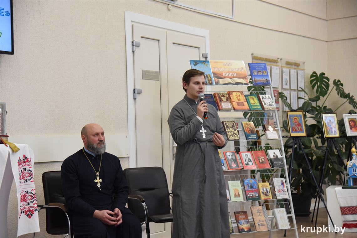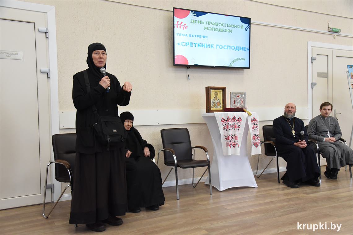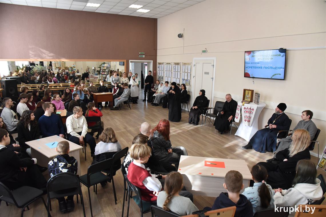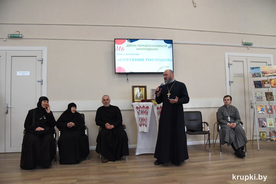 Праздничные мероприятия в Крупках начались с Божественной литургии в храме святителя Николая Чудотворца. После Бого­служения в Крупском районном центре культуры состоялся слет православной молодежи. В нем приняли участие молодежь и духо­венство Борисовской епархии, Крупского благочиния, ­насельники Свято-Елисаветинского монастыря, сестры милосердия, гости. В фойе на почетном месте разместилась икона Сретения Господня. Праздничную атмосферу создавали выставочные экспозиции. Крупский Центр детского творчества представил коллекцию народных костюмов «Крупщина православная», макеты храмов, иконы. На выставке районной библиотеки имени Я. Купалы ­гости знакомились с православной литературой.