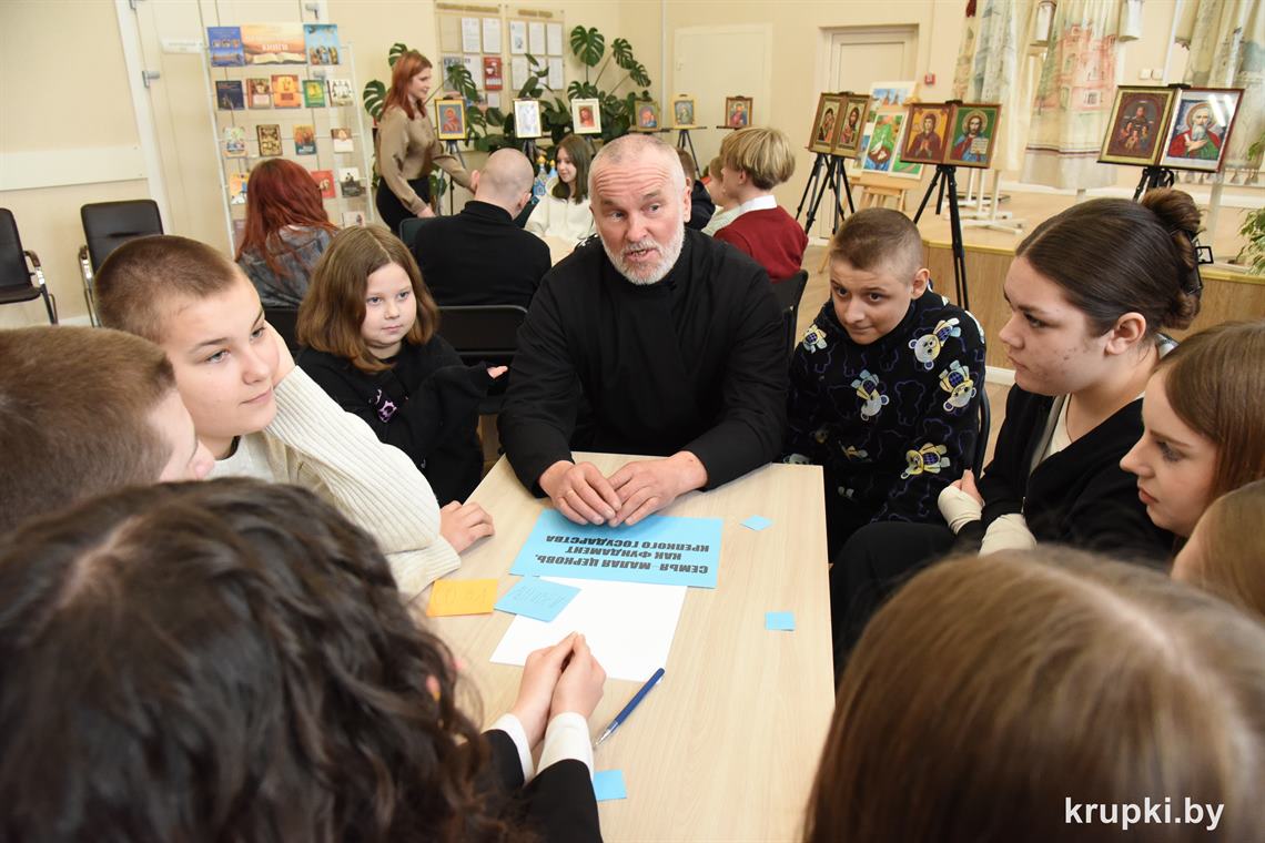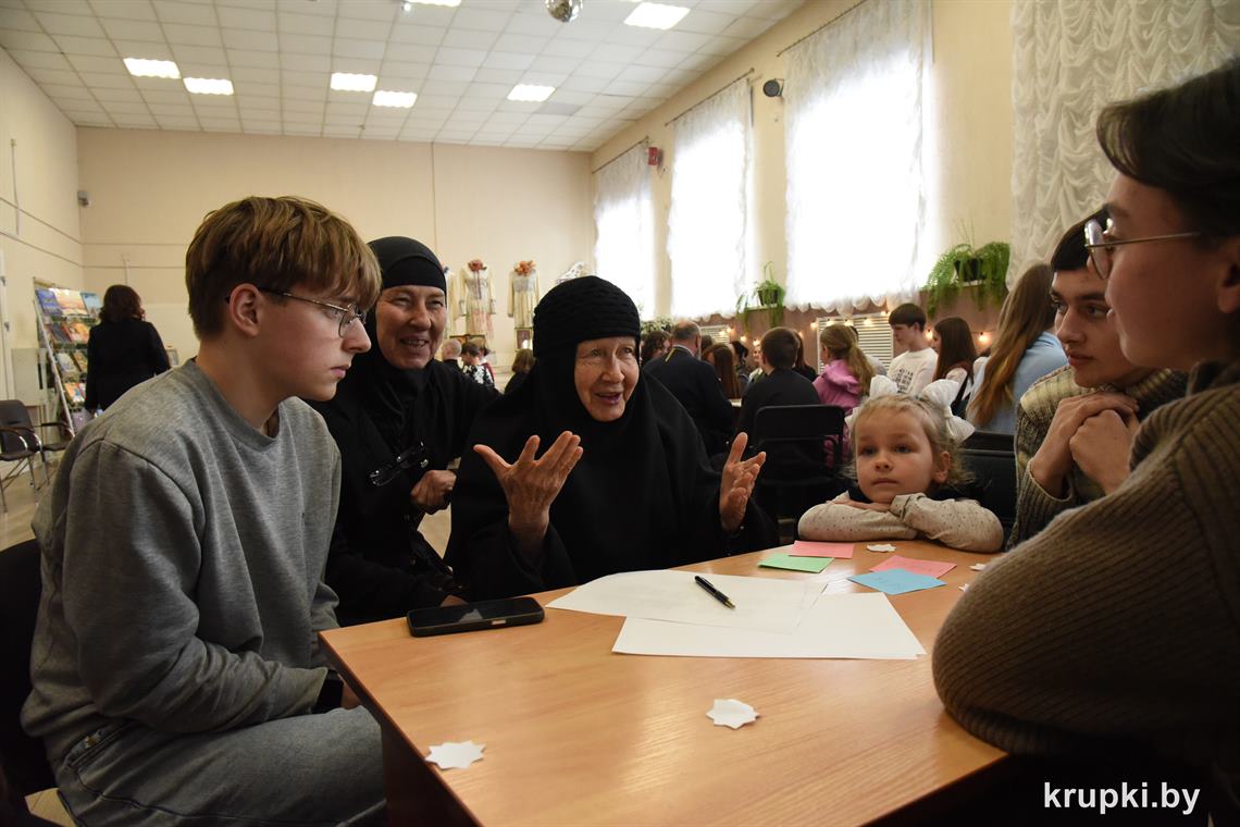 В группы к ребятам присоединились компетентные спикеры – благочинный Крупского церковного округа протоиерей Георгий Тюхлов, отец Степан, монахиня Мария, Любовь Матырко, куратор Крупского благочиния Сергей Сачук. Каждая группа получила задание. Им предстояло порас­суждать над серьезными вопросами: «Слова – это яд и лекарство», «Семья – это малая церковь, как фундамент крепкого государства», «Любовь – это...», «Кто такой Бог?», «Жизнь, для чего ты мне нужна?» В этом им помогали спикеры. После подготовки ребята озвучили свои мысли и раскрыли заданные темы. Молодежь рассуждала по-философски, обращаясь к Библии, размышляла, опираясь на свой опыт и поступки: