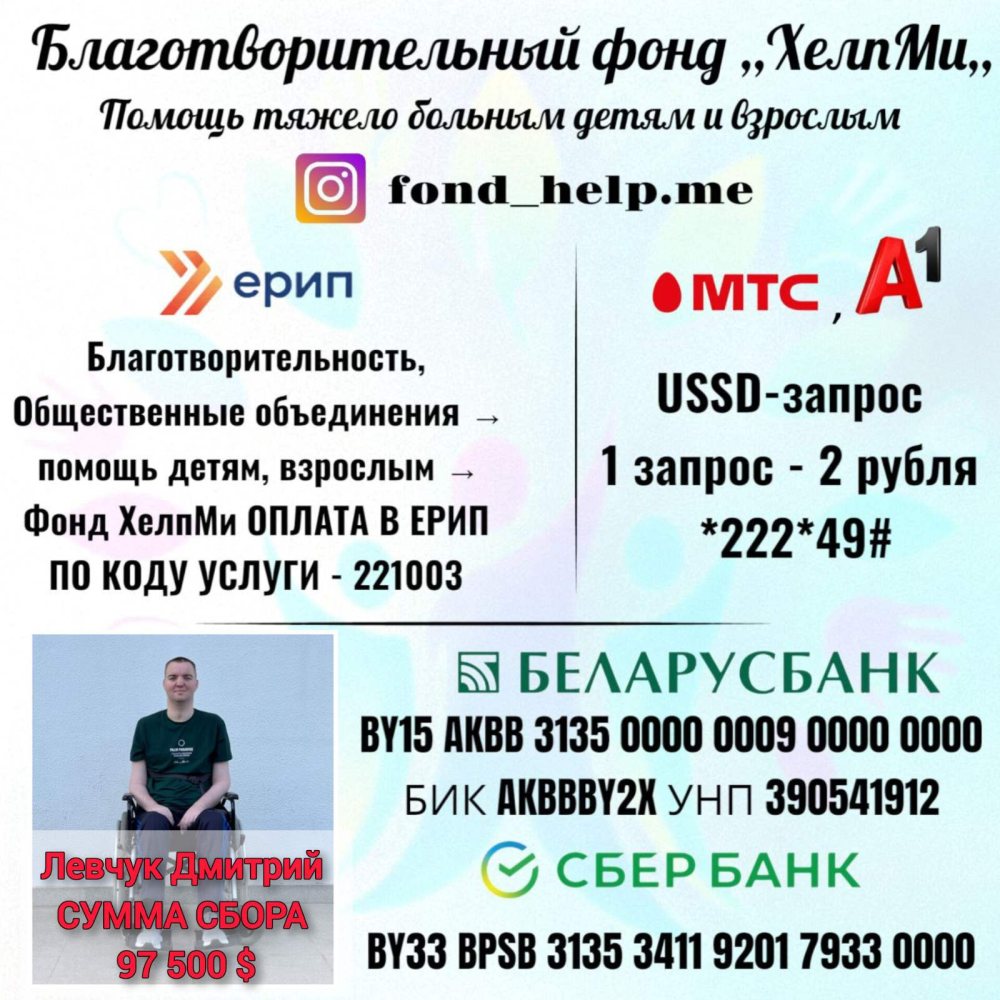 Просим Вас помочь в сборе средств любой суммой, а также рассмотреть возможность размещения на Ваших информационных ресурсах информацию о сборе средств на лечение и реабилитацию Левчука Дмитрия Александровича.