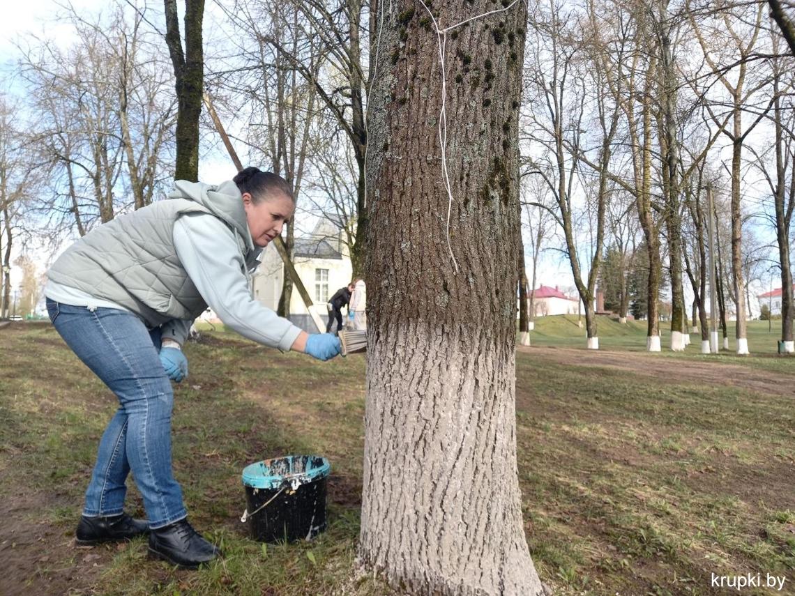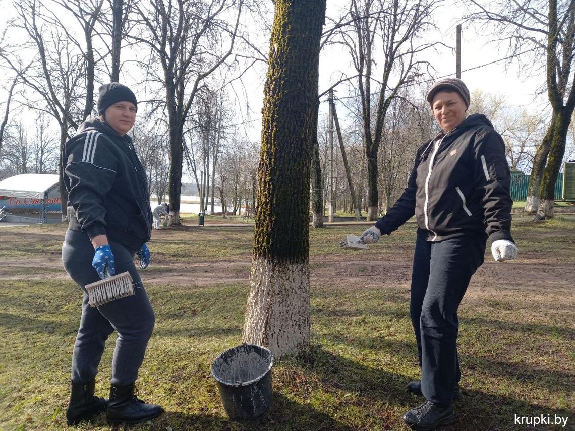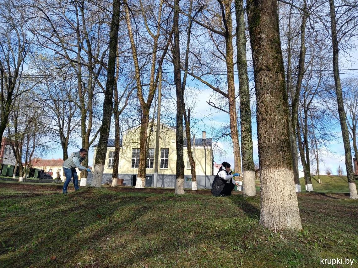 Кипит работа в городском парке: сотрудники районного Центра по обеспечению деятельности бюджетных организаций наводят чистоту, белят деревья.