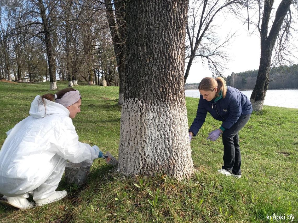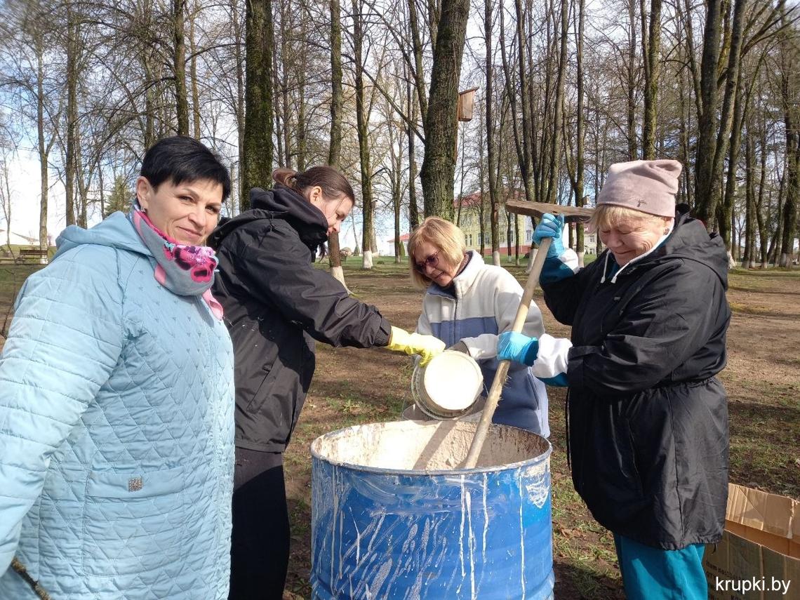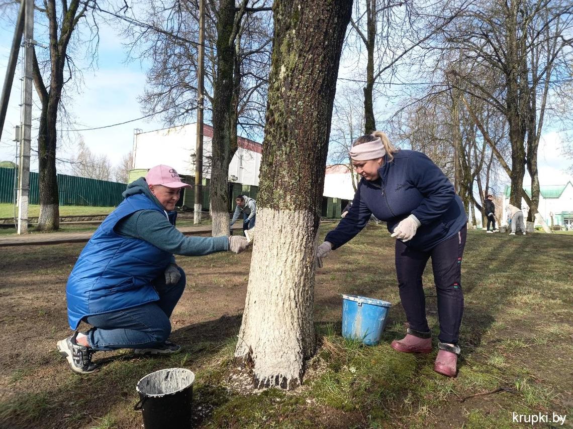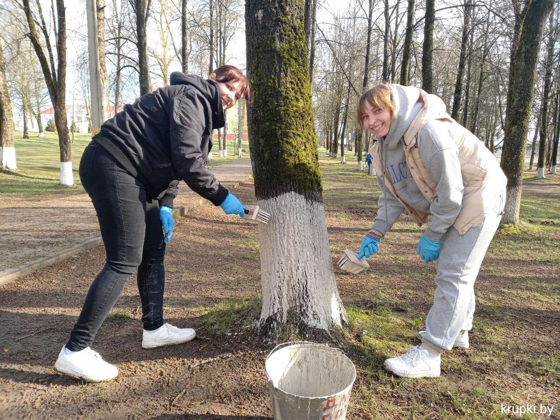 Кипит работа в городском парке: сотрудники районного Центра по обеспечению деятельности бюджетных организаций наводят чистоту, белят деревья.