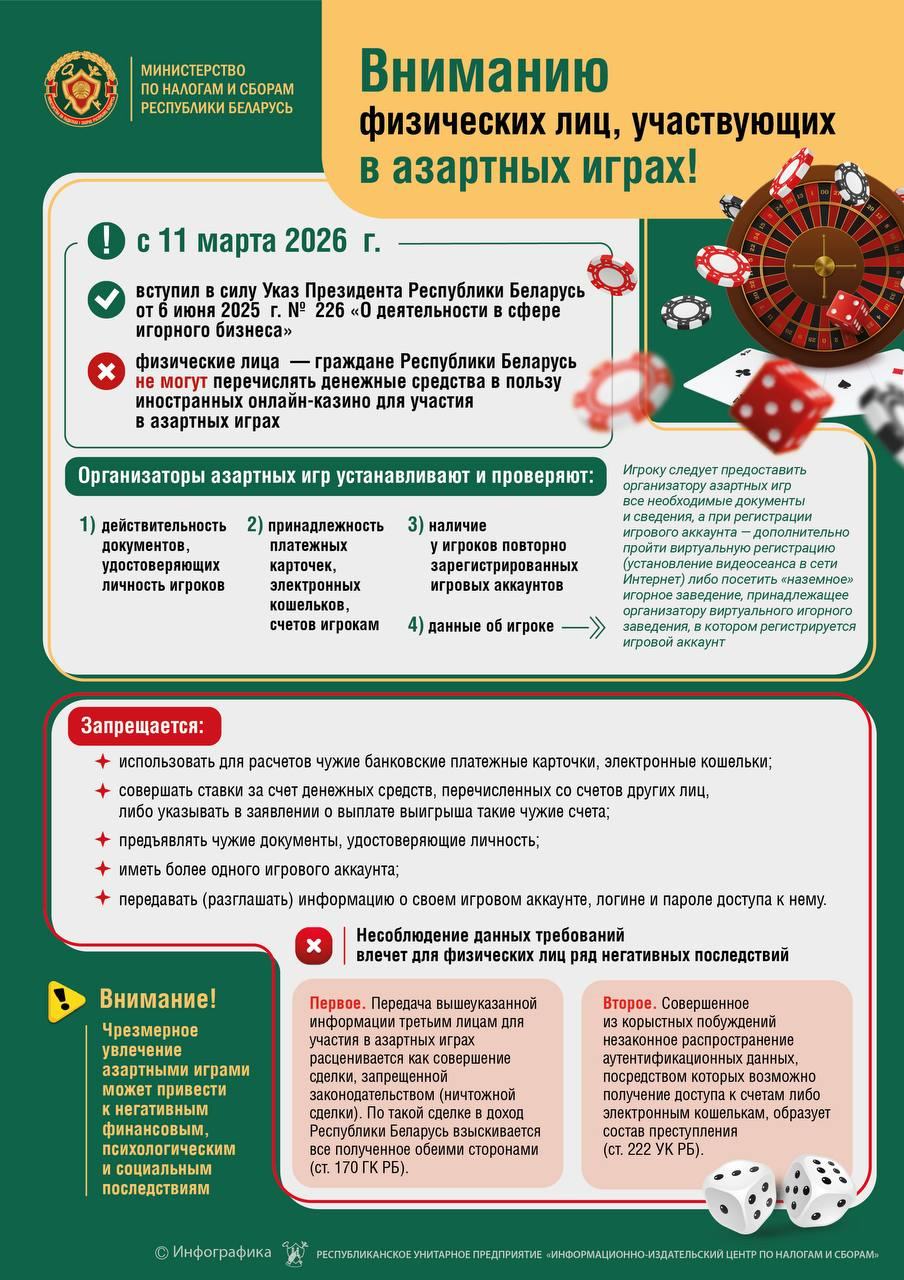 С 11 марта 2026 г. вступил в силу Указ Президента Республики Беларусь от 6 июня 2025 г. № 226 «О деятельности в сфере игорного бизнеса», физические лица – граждане Республики Беларусь не могут перечислять денежные средства в пользу иностранных онлайн-казино для участия в азартных играх.