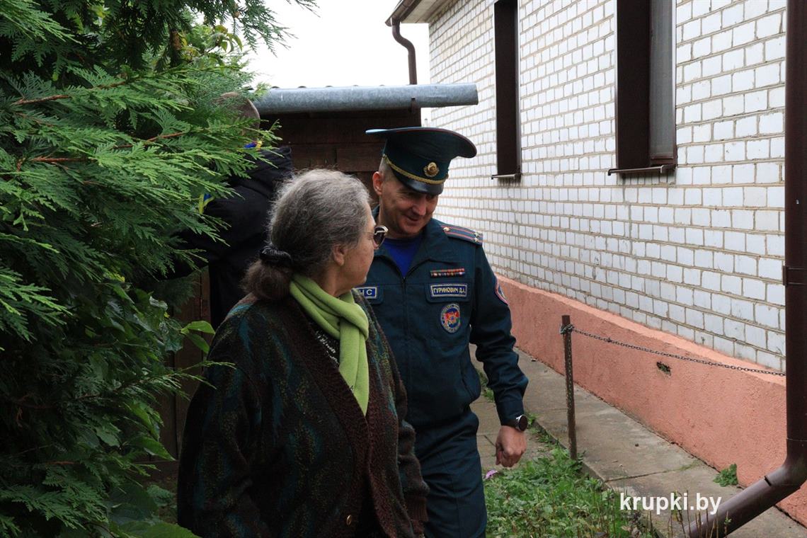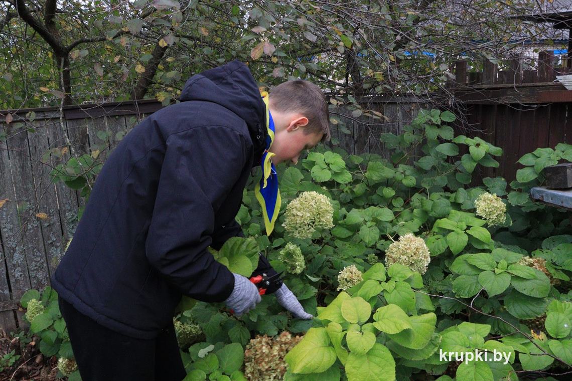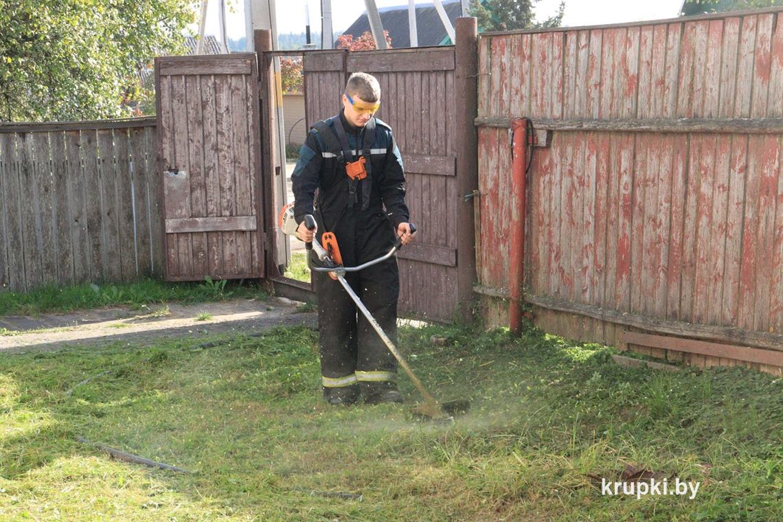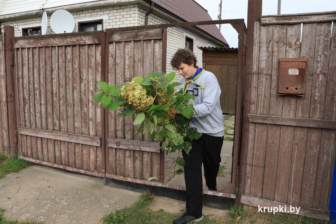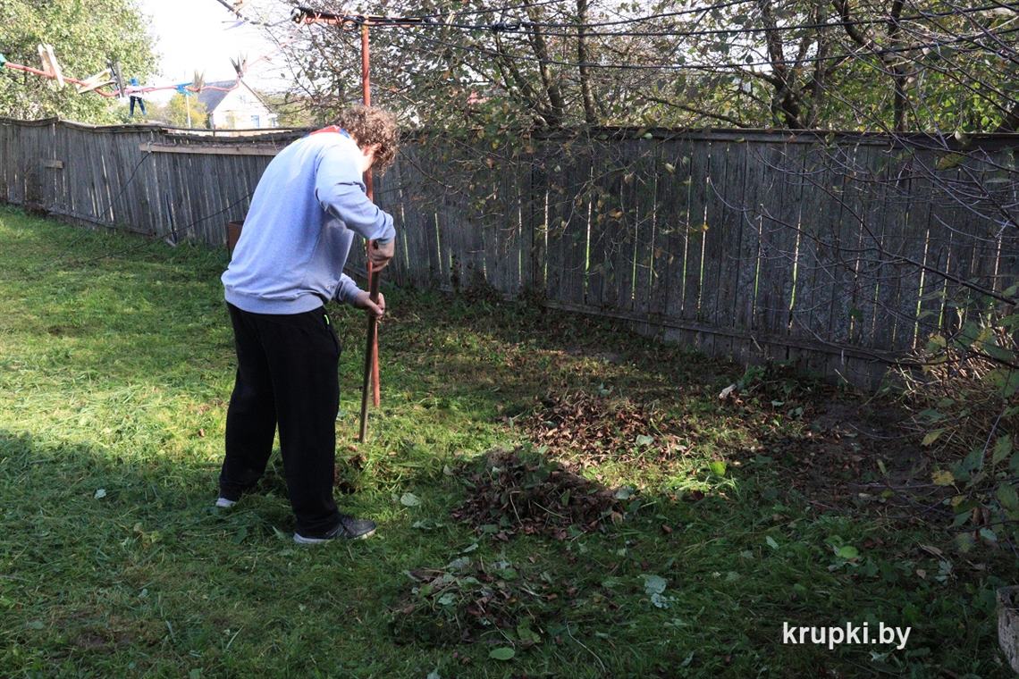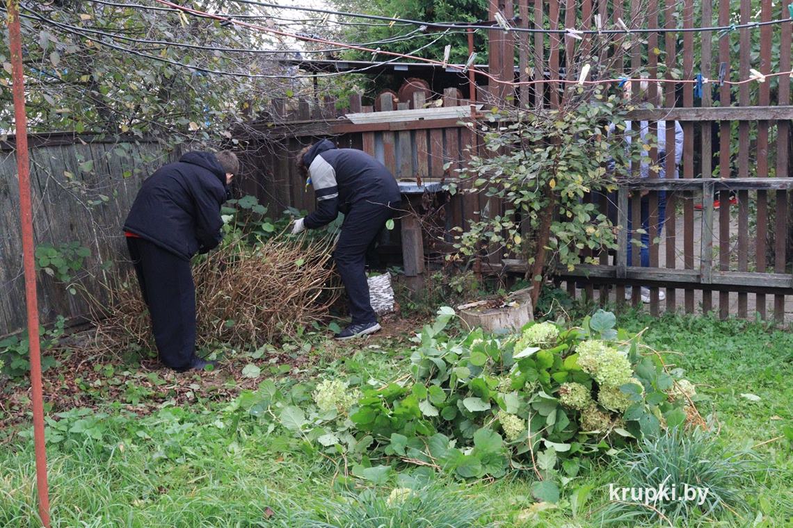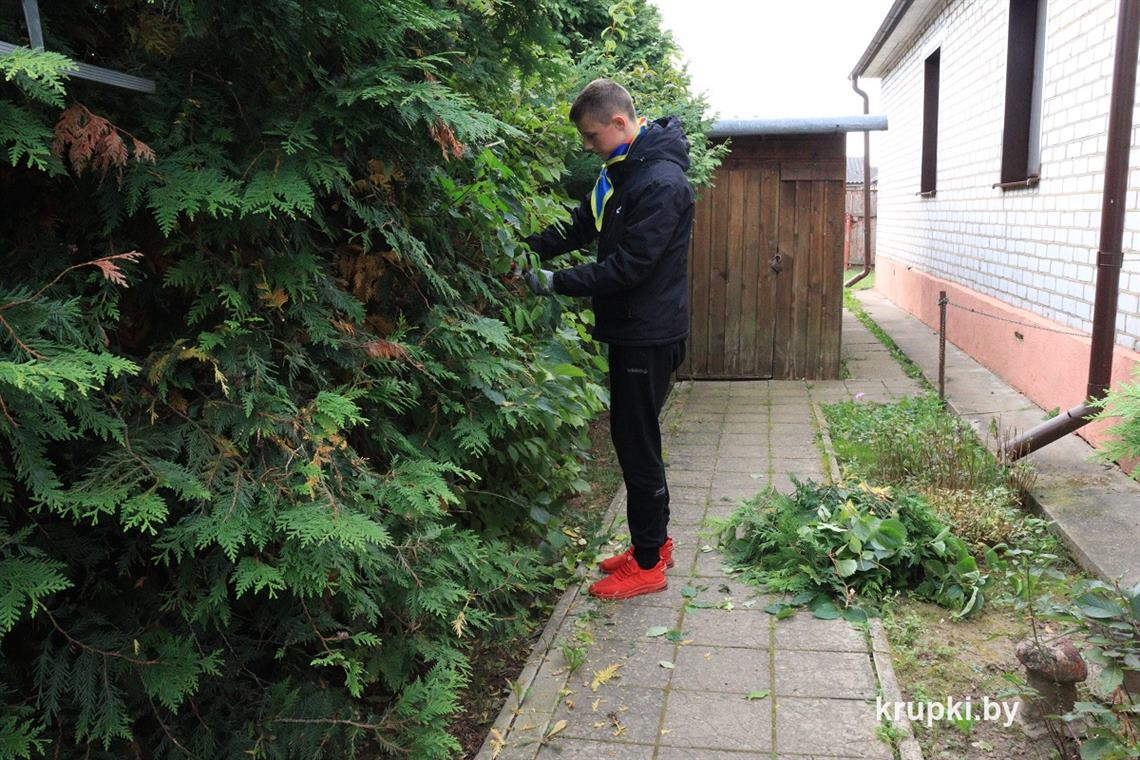 Первый адресат в городе Крупки. Волей судьбы Любовь Владимировна Чаленко осталась одна. Родом с Крупщины, долго жила в Москве, потом вернулась на малую родину. Говорит, где родился там и пригодился. Очень активная и общительная. По хозяйству ей помогает социальный работник. Но все же есть дела, с которыми пожилая женщина справиться не может в виду «золотого возраста». Поэтому на помощь пришли работники Крупского районного отдела по ЧС и юные спасатели из гимназии. А работы было много: обкосить участок, сгрести и вынести траву, подмести двор, обрезать осенние кустарники и туи, которые разрослись так, что не пройти по дорожке к дому.