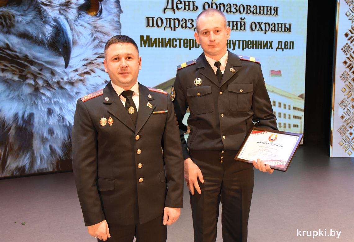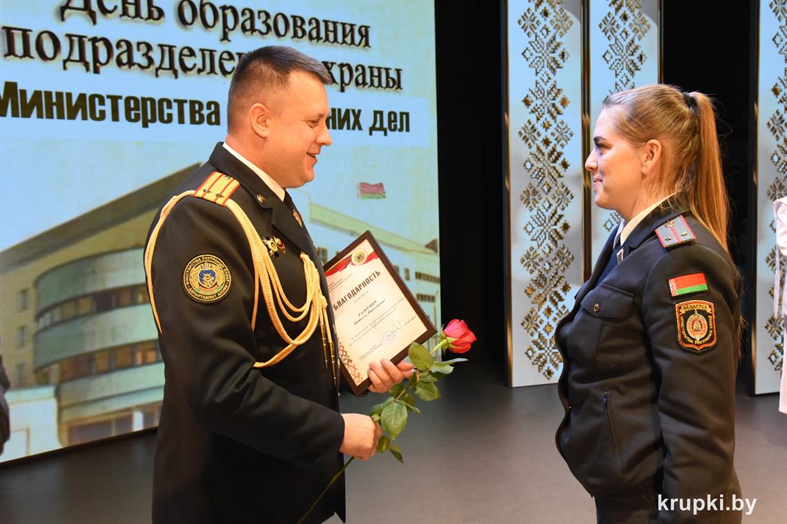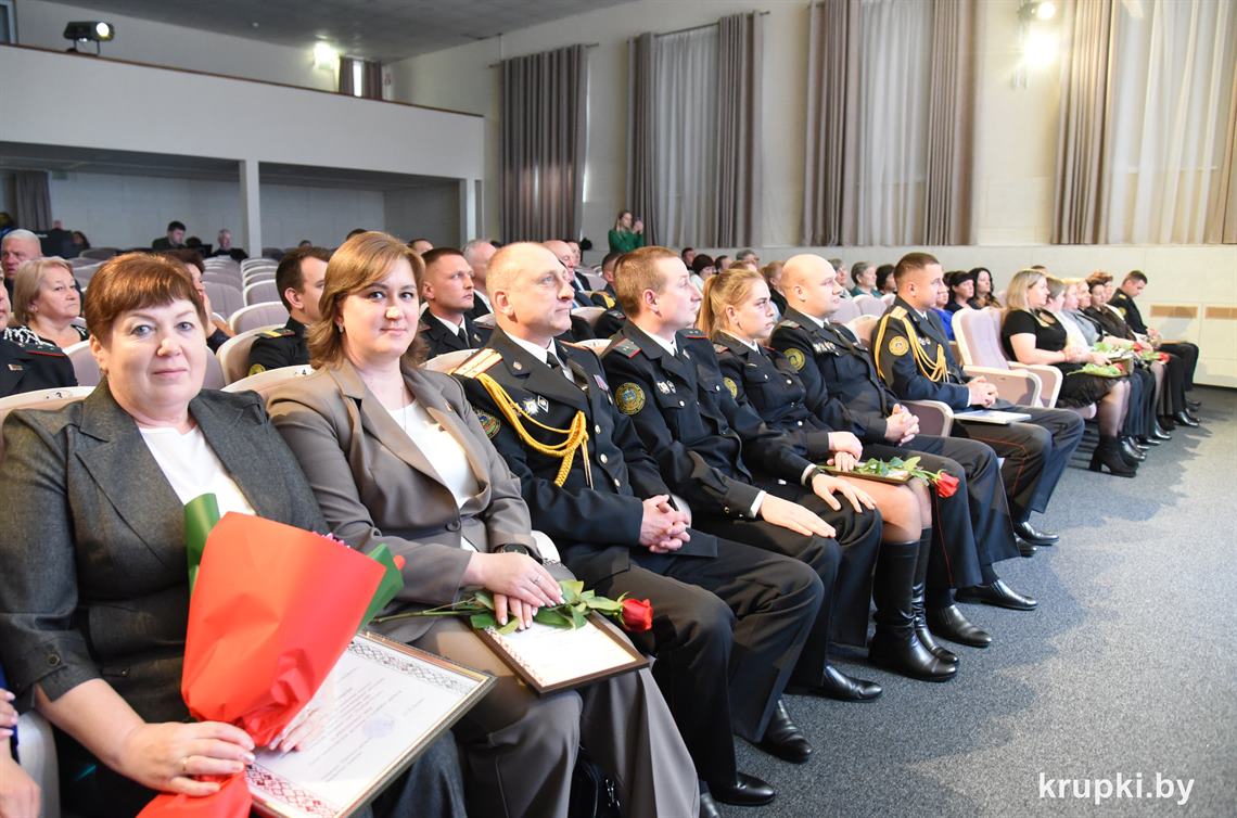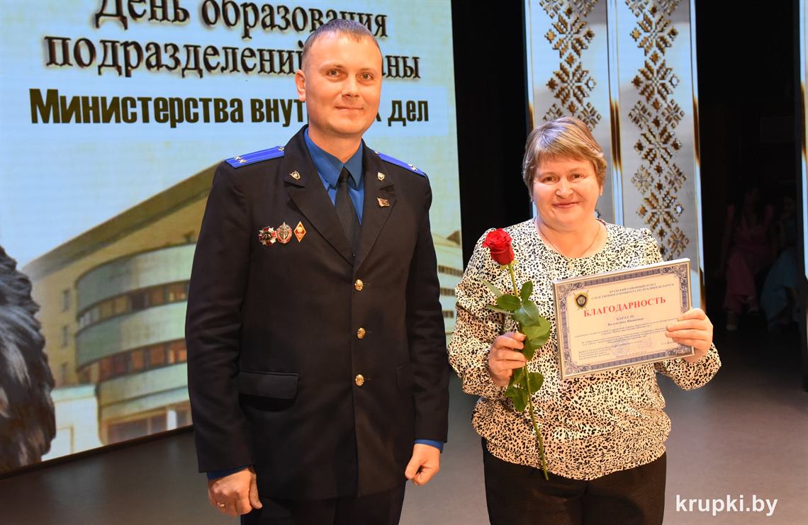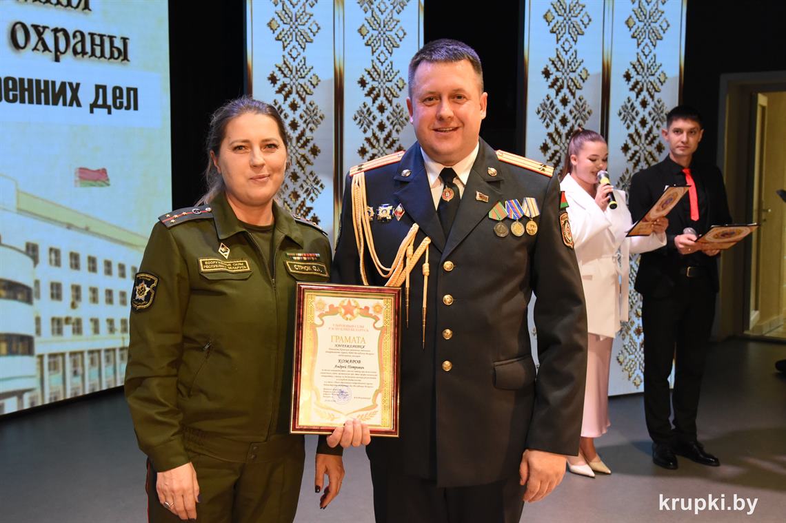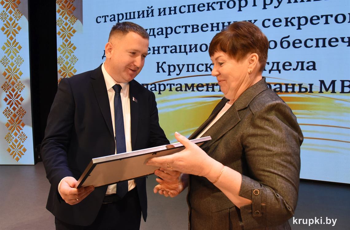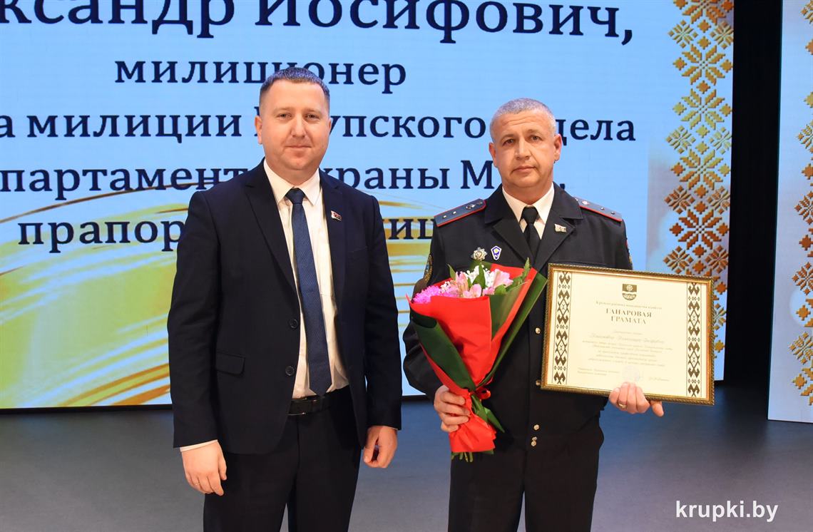 Почетной грамотой Крупского райисполкома отмечен Александр Альхимович - милиционер взвода милиции. Благодарность председателя Крупского райисполкома получила Елена Воронина - старший инспектор группы защиты государственных секретов и документационного обеспечения.