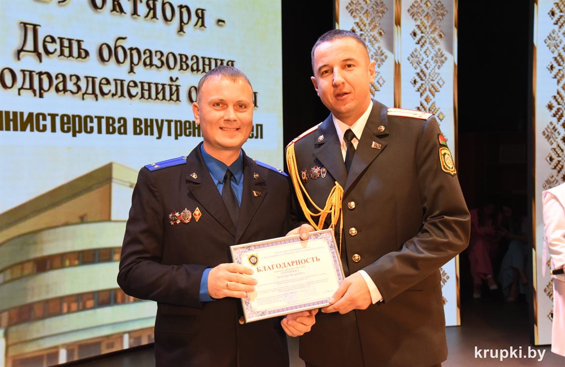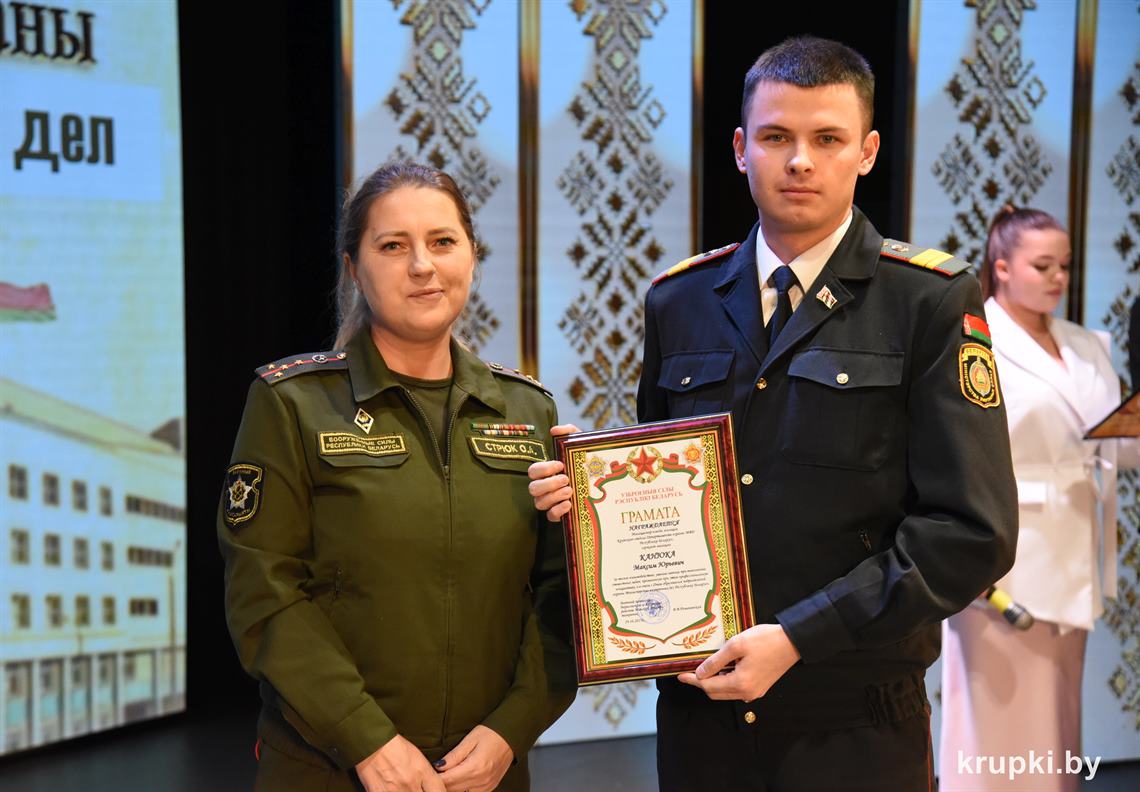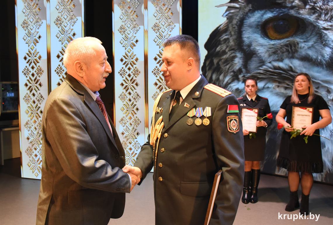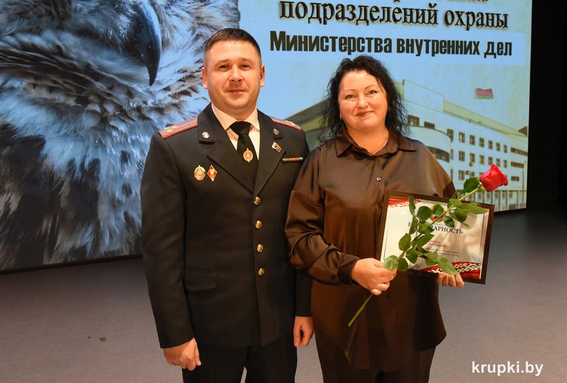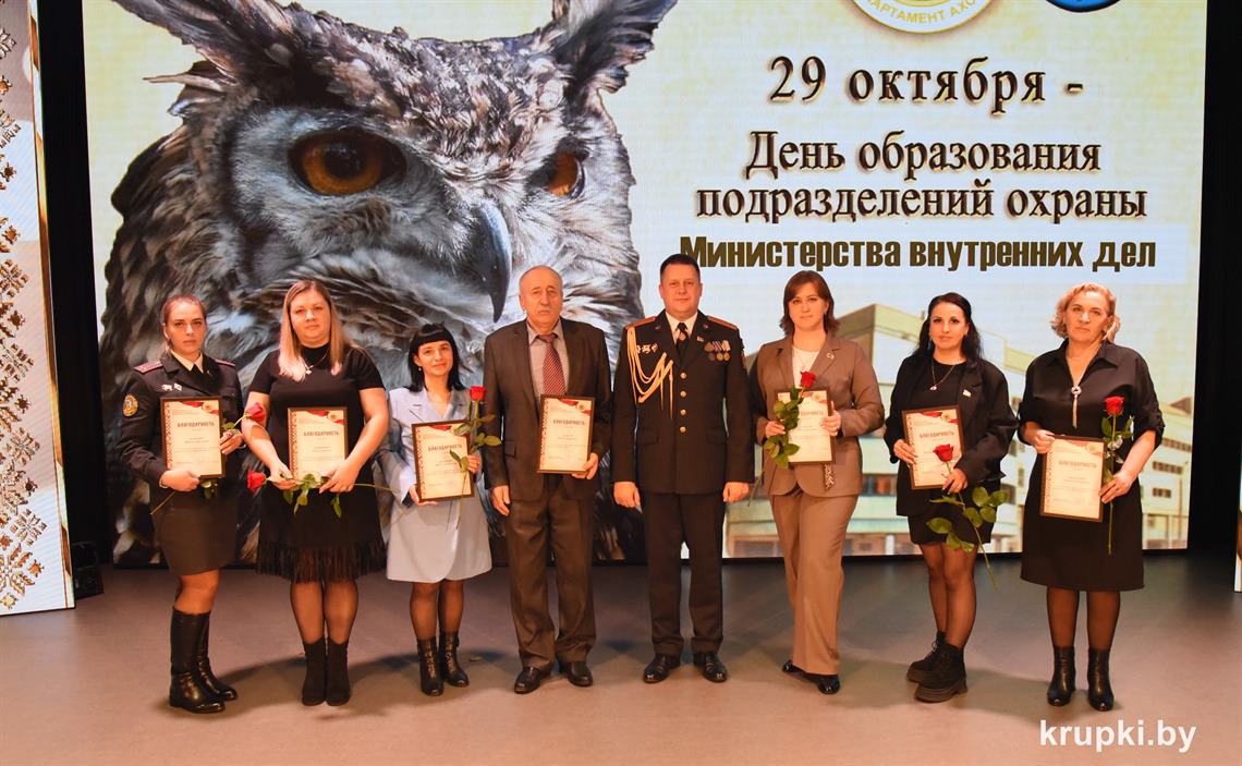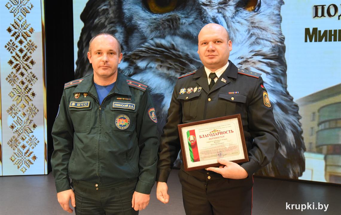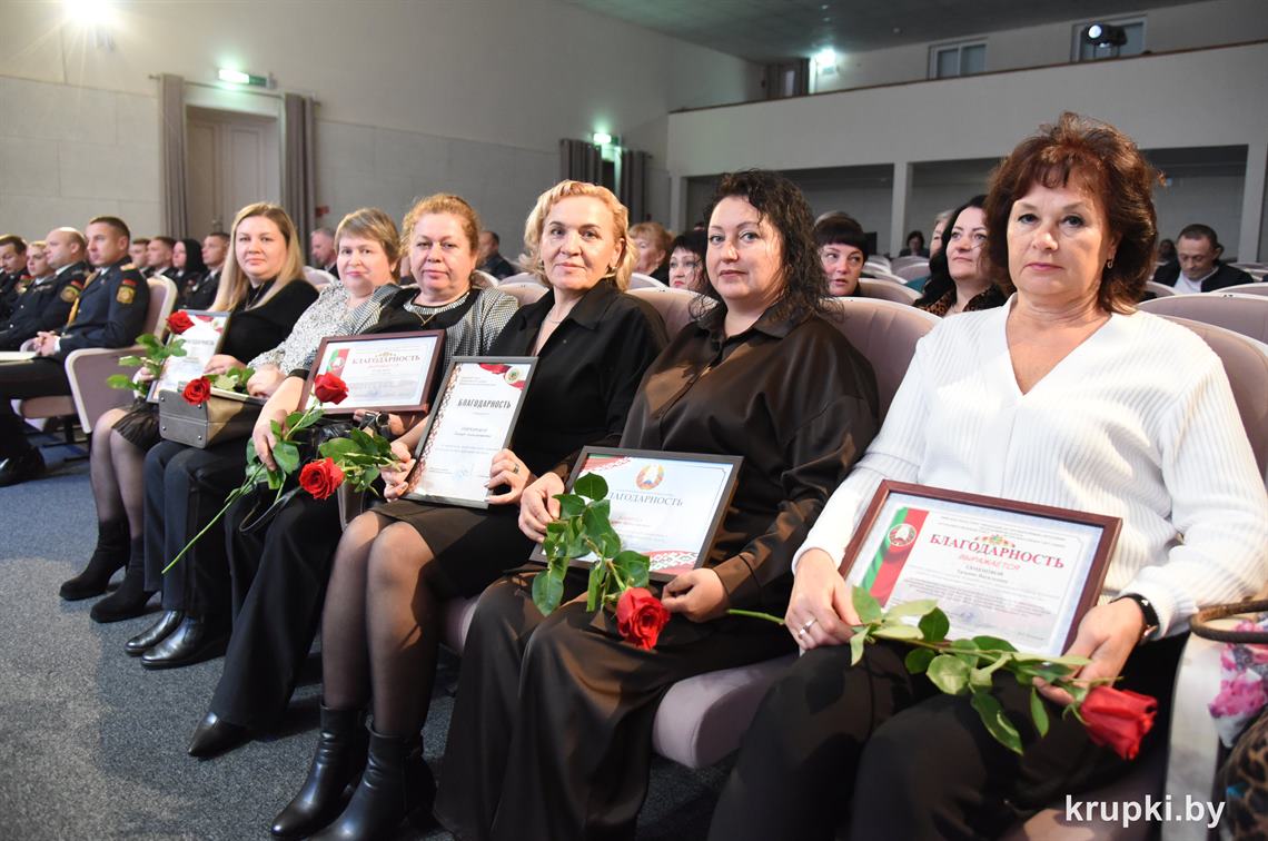 Почетной грамотой Крупского райисполкома отмечен Александр Альхимович - милиционер взвода милиции. Благодарность председателя Крупского райисполкома получила Елена Воронина - старший инспектор группы защиты государственных секретов и документационного обеспечения.