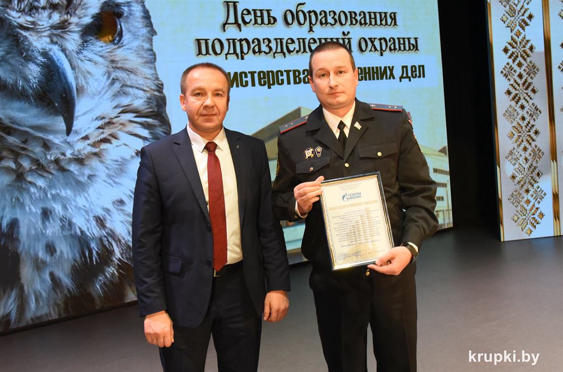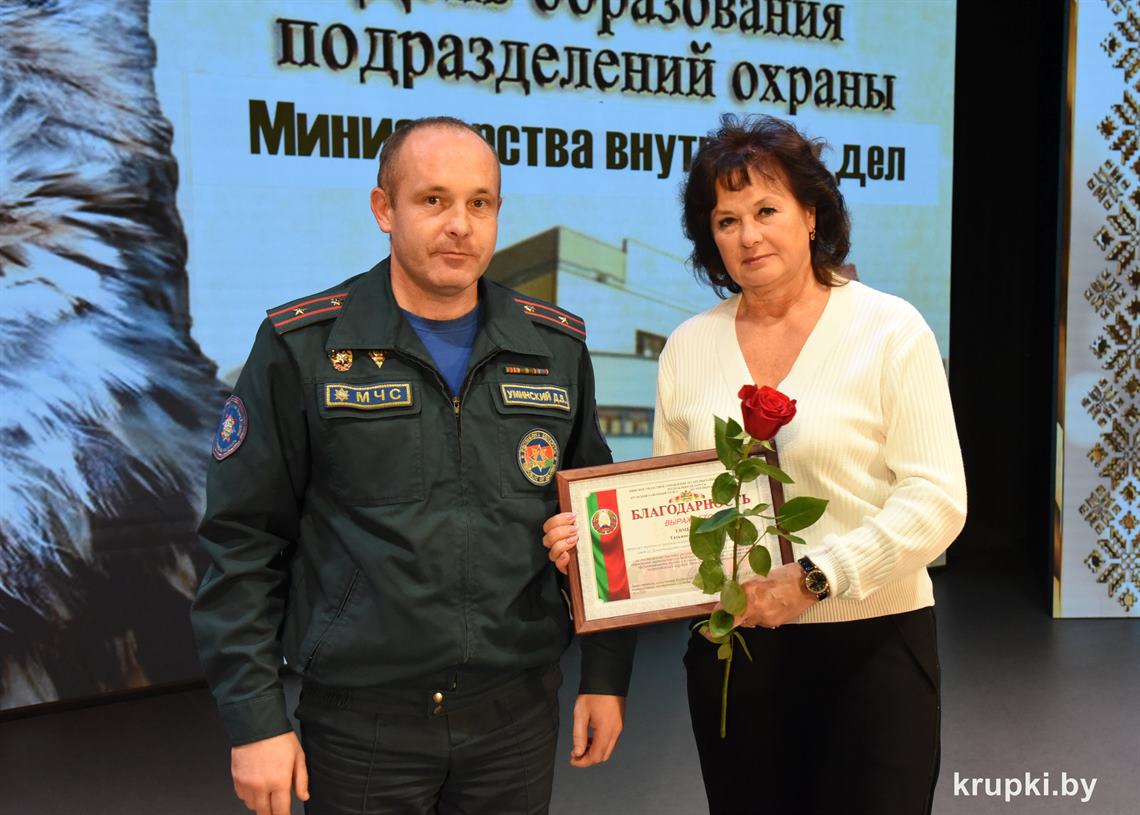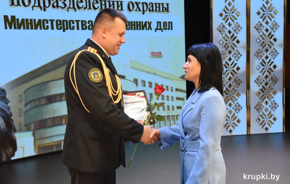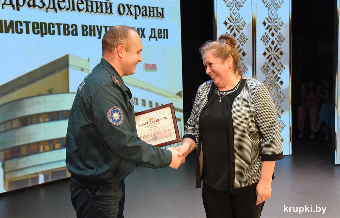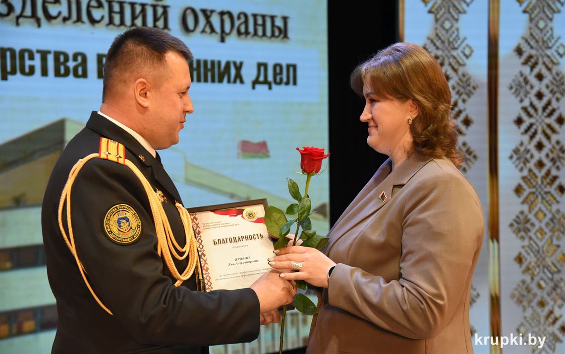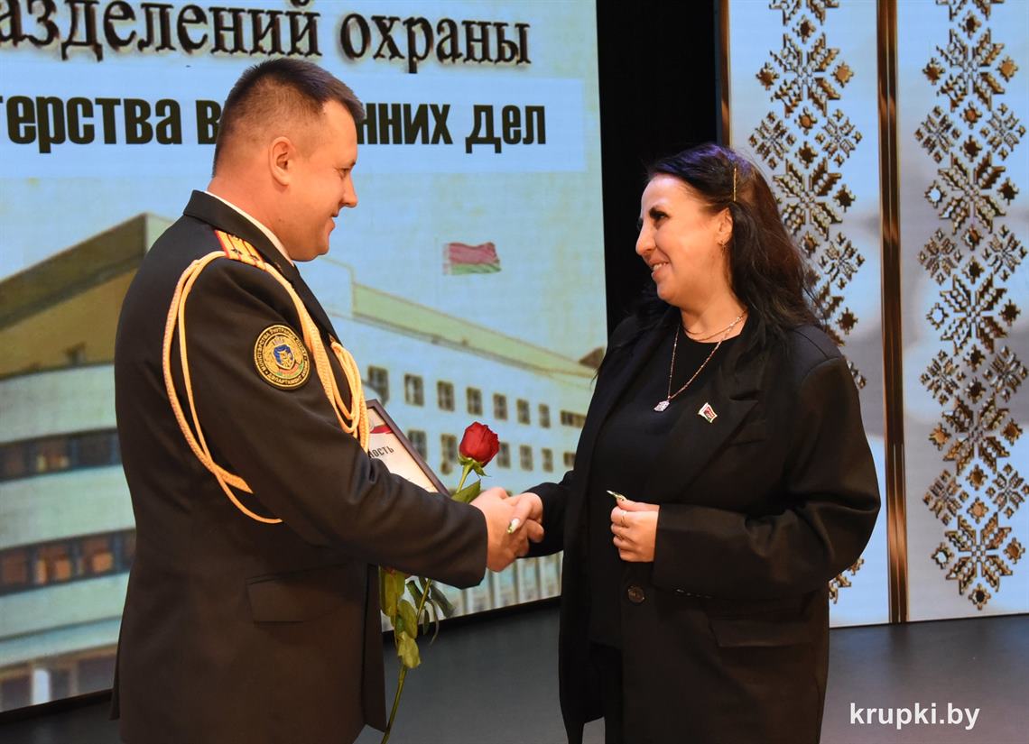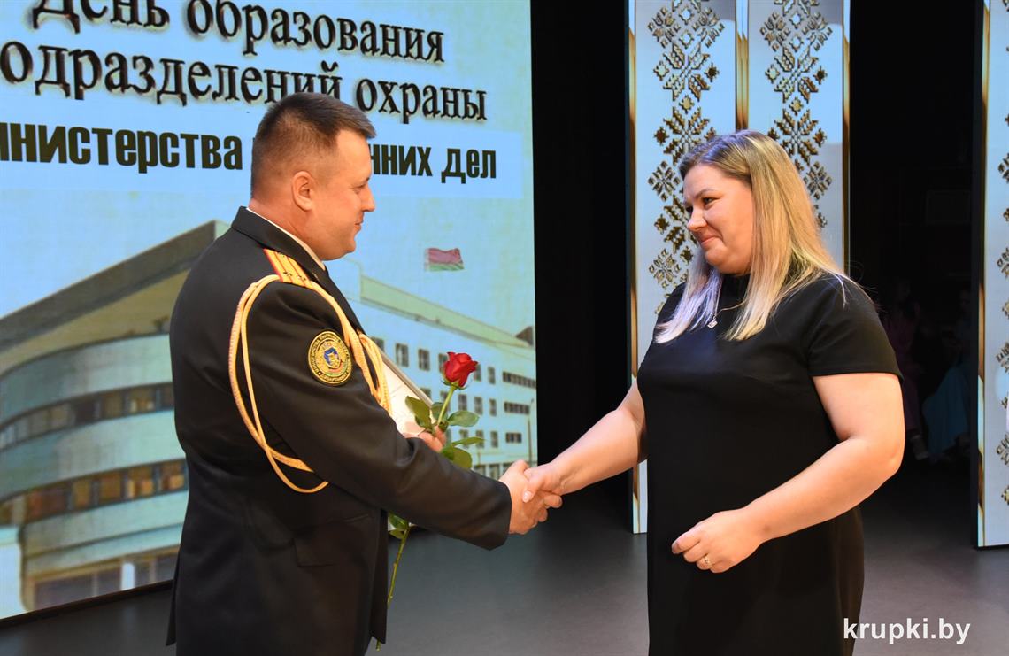 Почетной грамотой Крупского райисполкома отмечен Александр Альхимович - милиционер взвода милиции. Благодарность председателя Крупского райисполкома получила Елена Воронина - старший инспектор группы защиты государственных секретов и документационного обеспечения.
