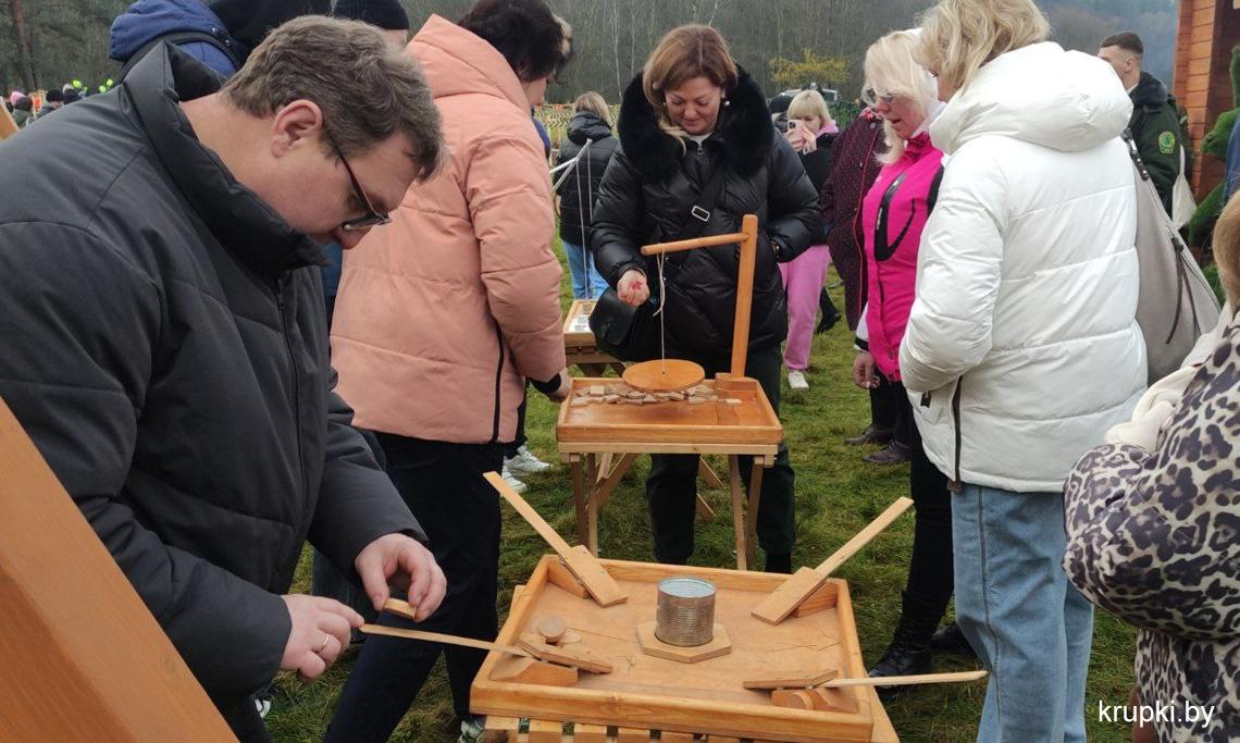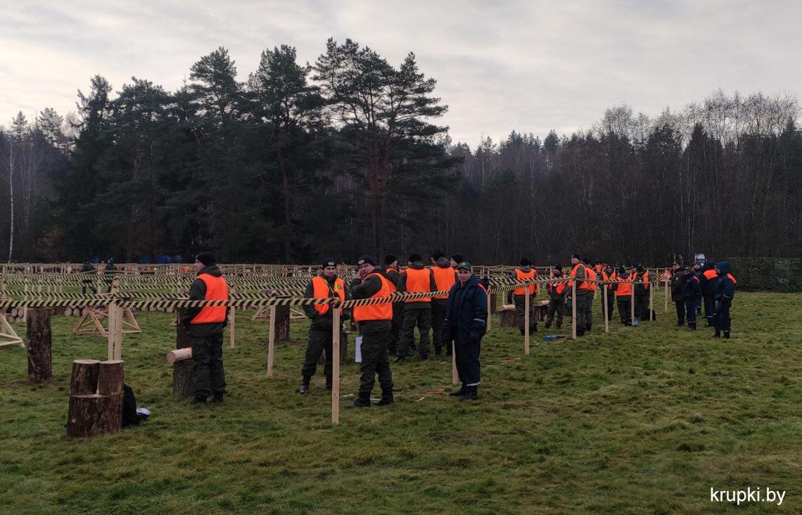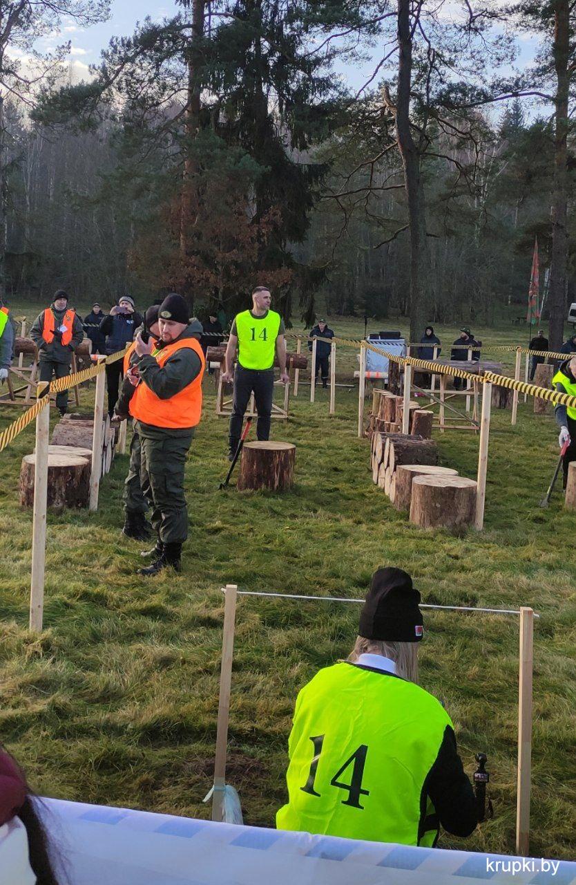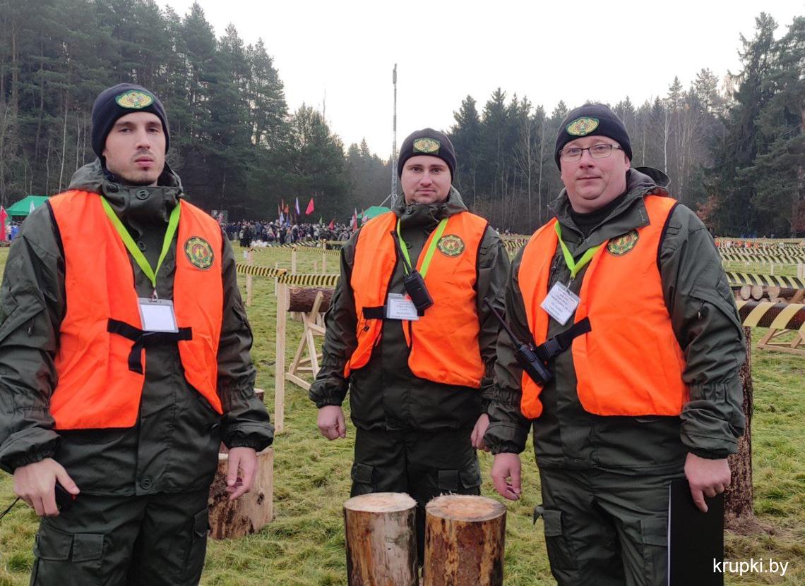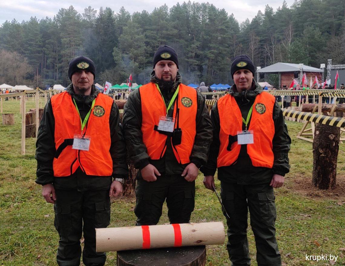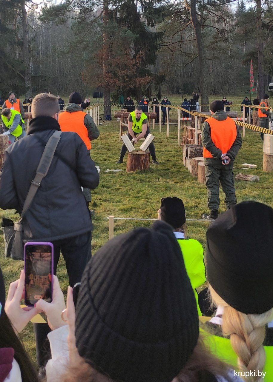 На чемпионате по колке дров работают в составе судейской коллегии представители Крупского лесхоза. Они оценивают выступления команд журналистов.