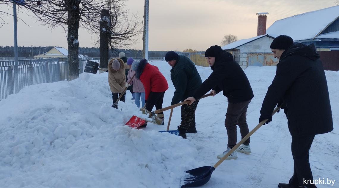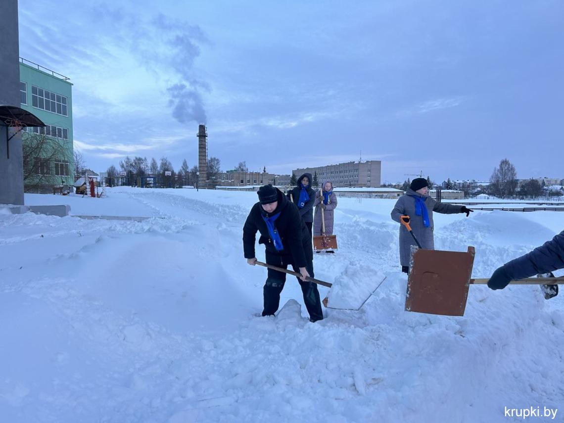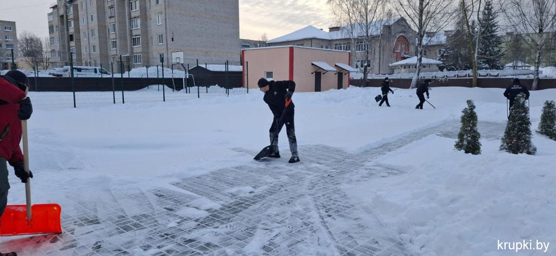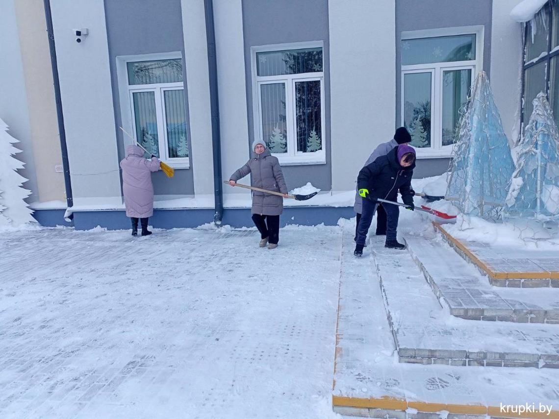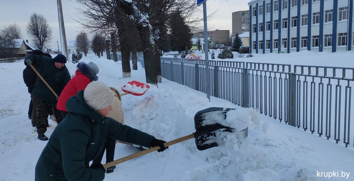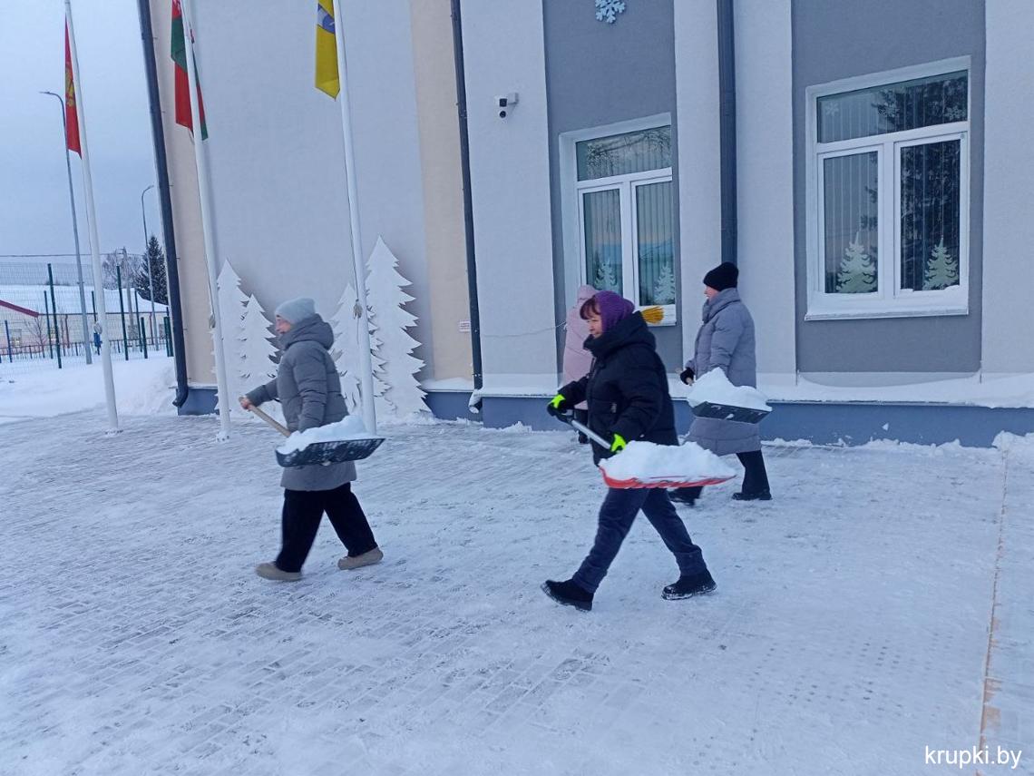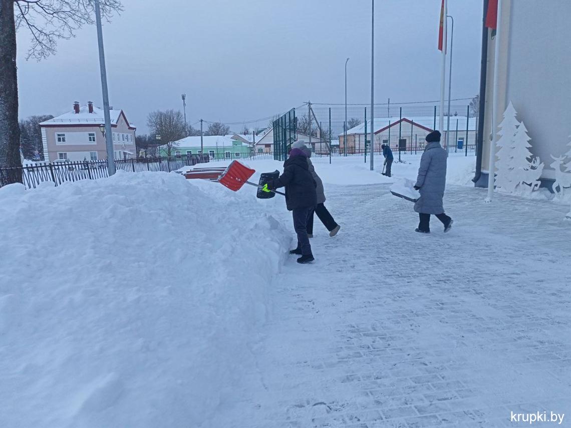 Крупская районная гимназия с самого утра включилась в уборку снега.