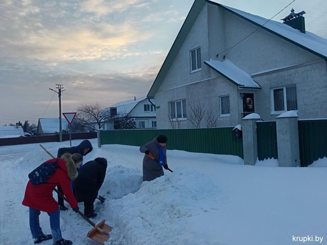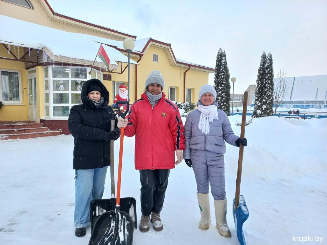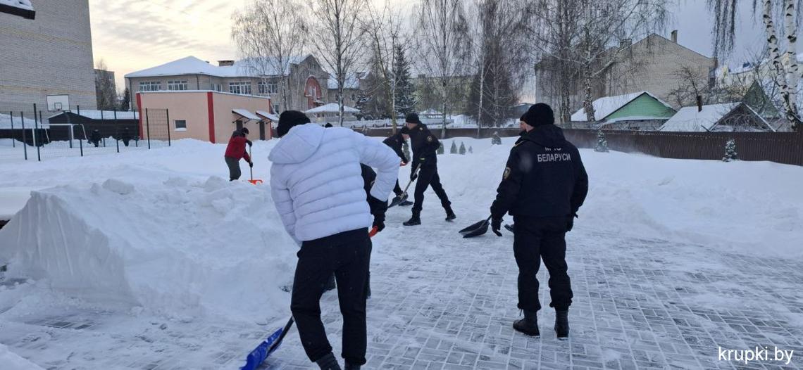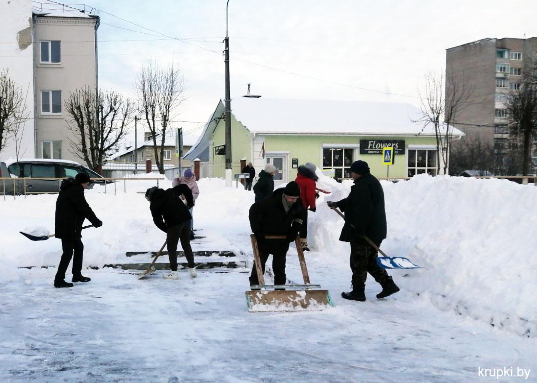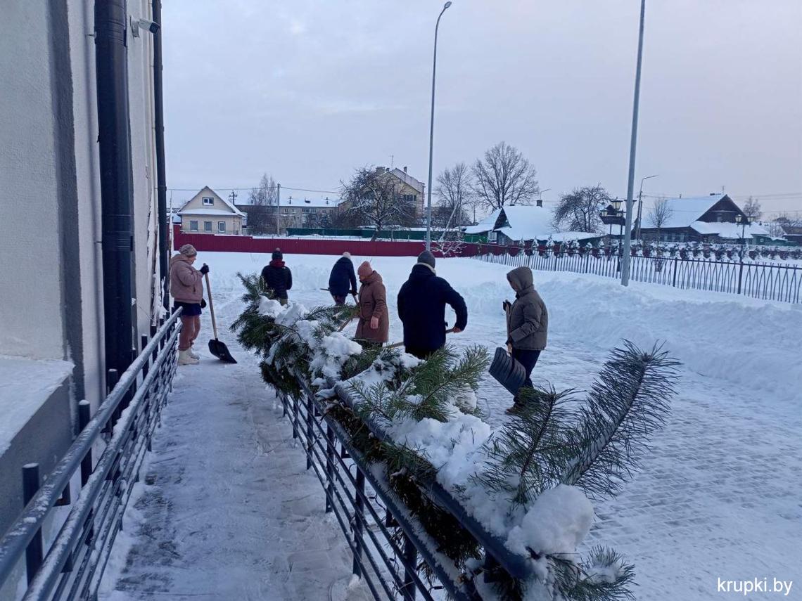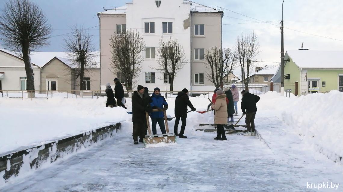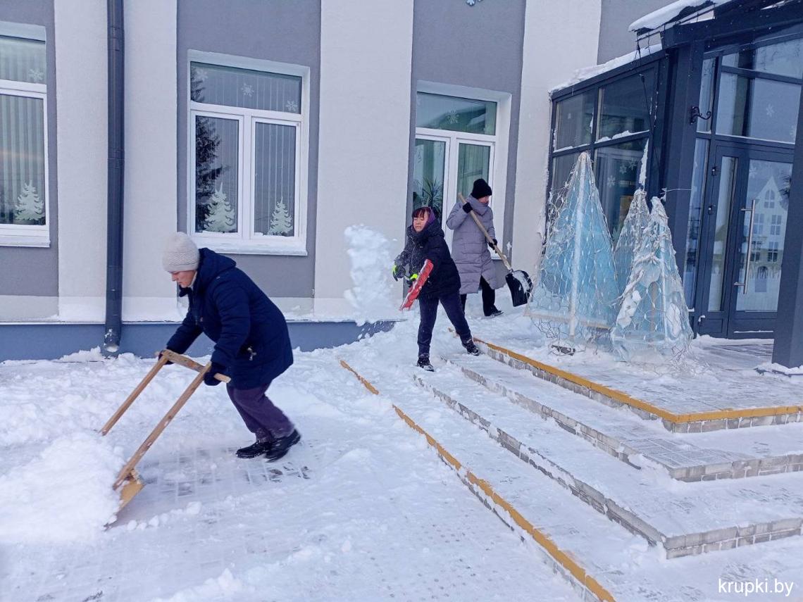 Крупская районная гимназия с самого утра включилась в уборку снега.