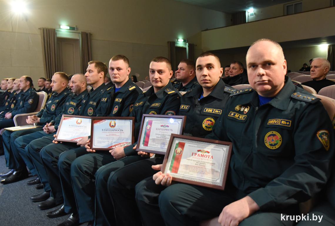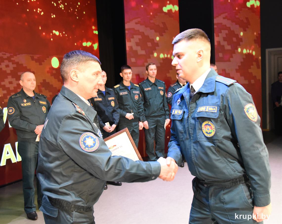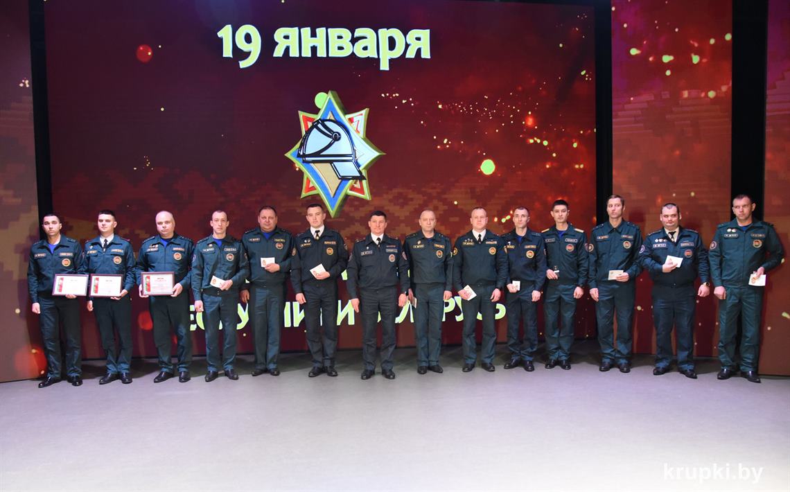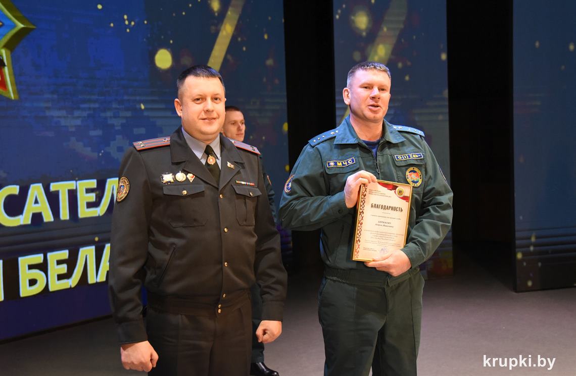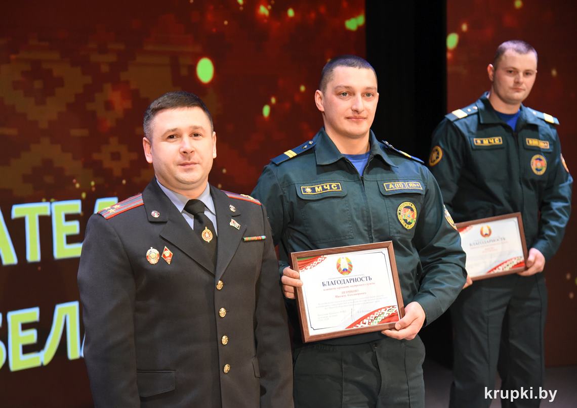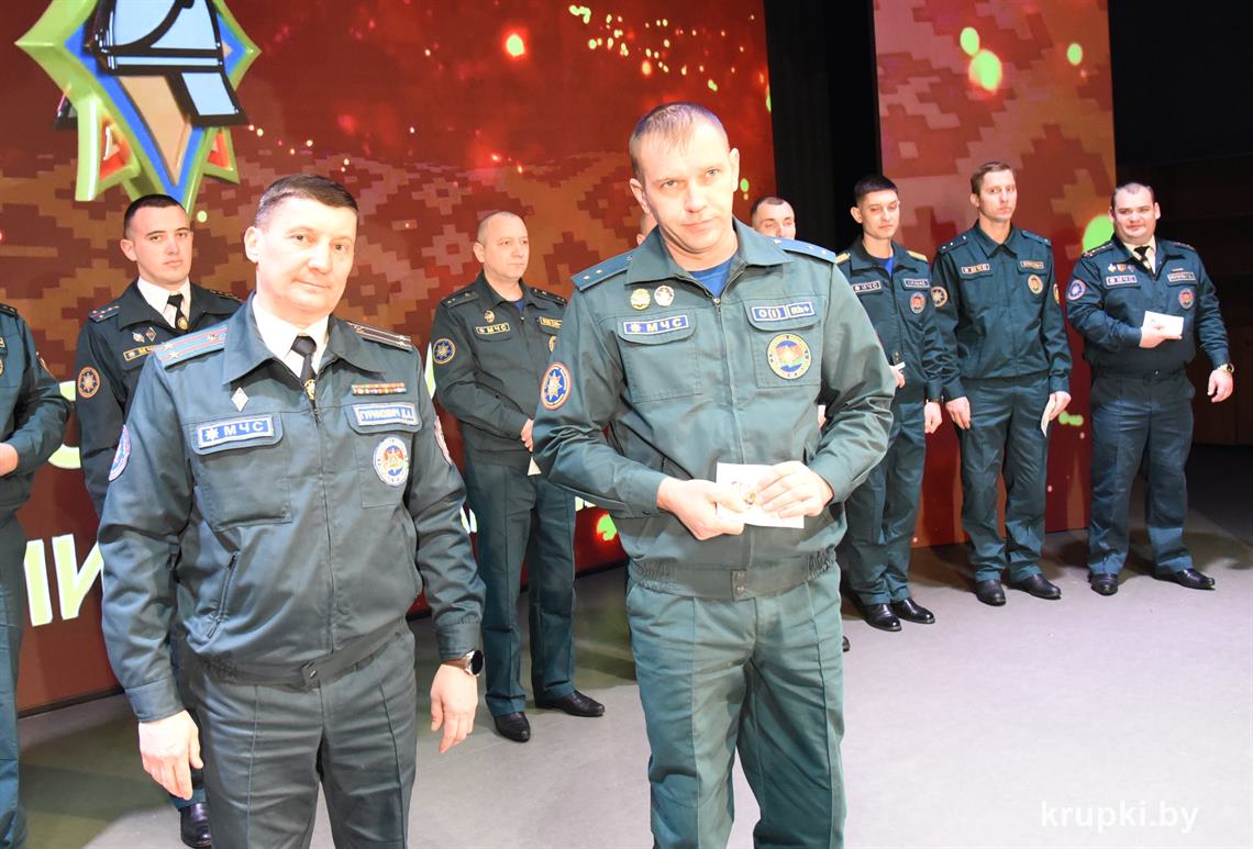 Слова поздравления и благодарности звучали со сцены от начальника Крупского РОЧС Дмитрия Гуриновича, начальника Крупского РОВД Игоря Познякова, начальника Крупского районного отдела Следственного комитета Александра Кожевко, начальника Крупского отдела Департамента охраны МВД Андрея Комарова.