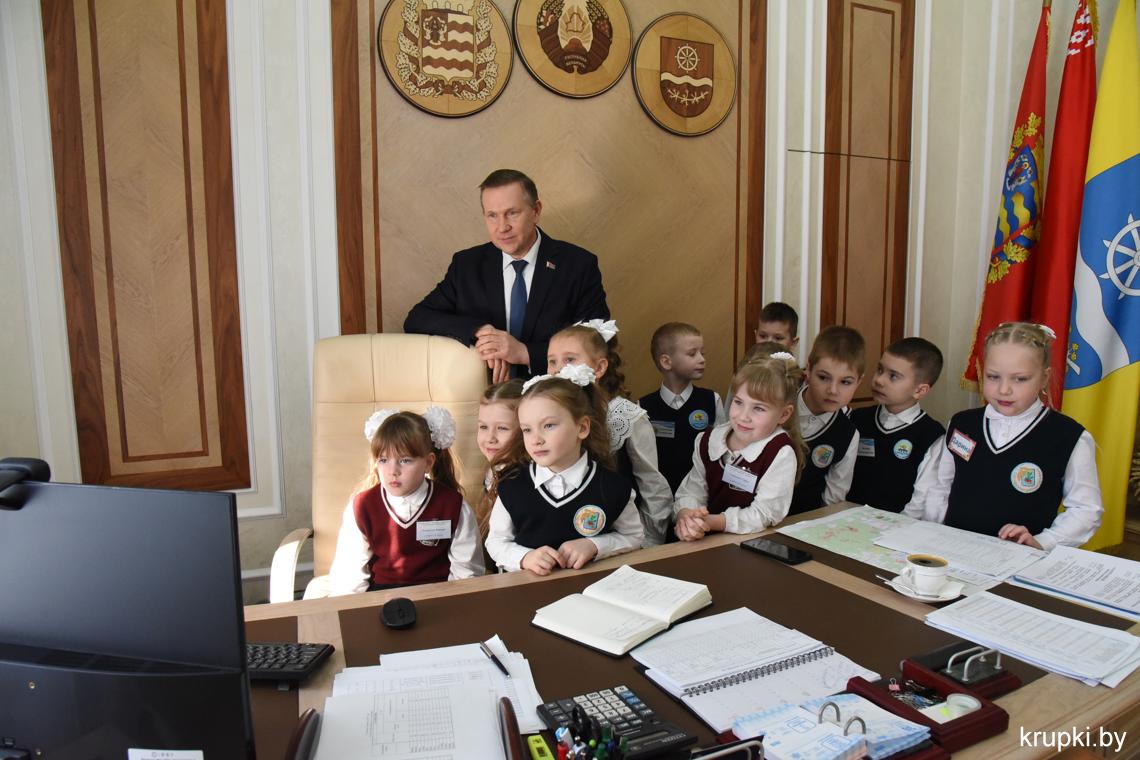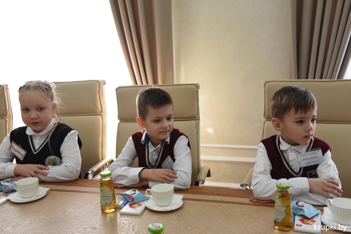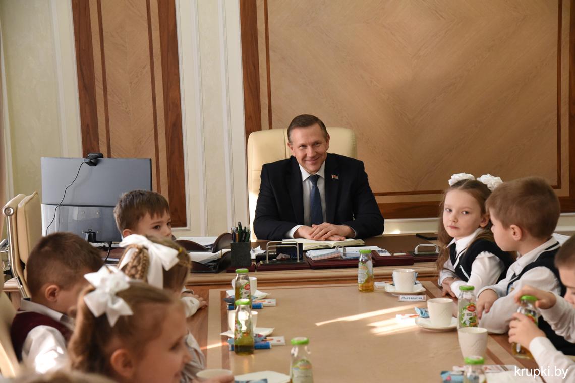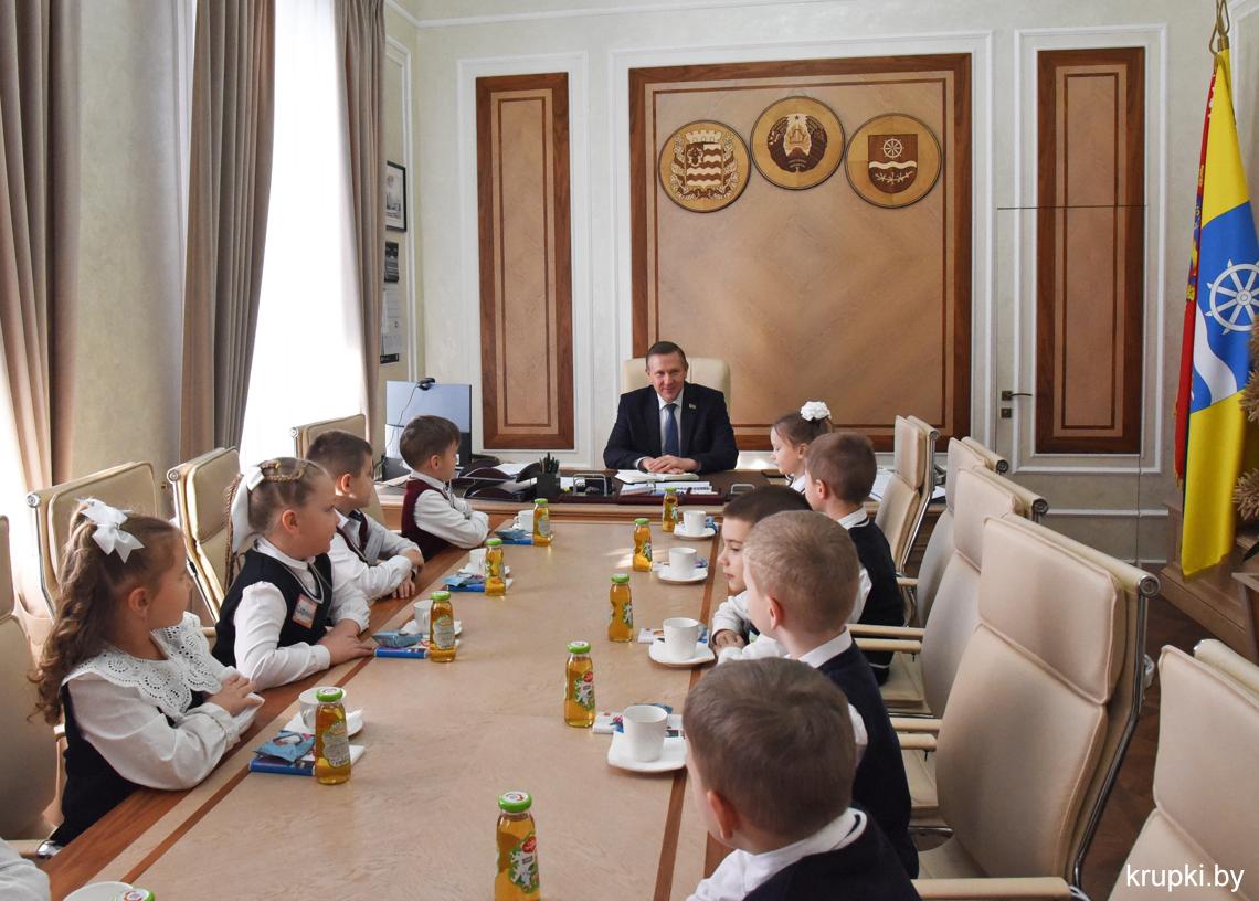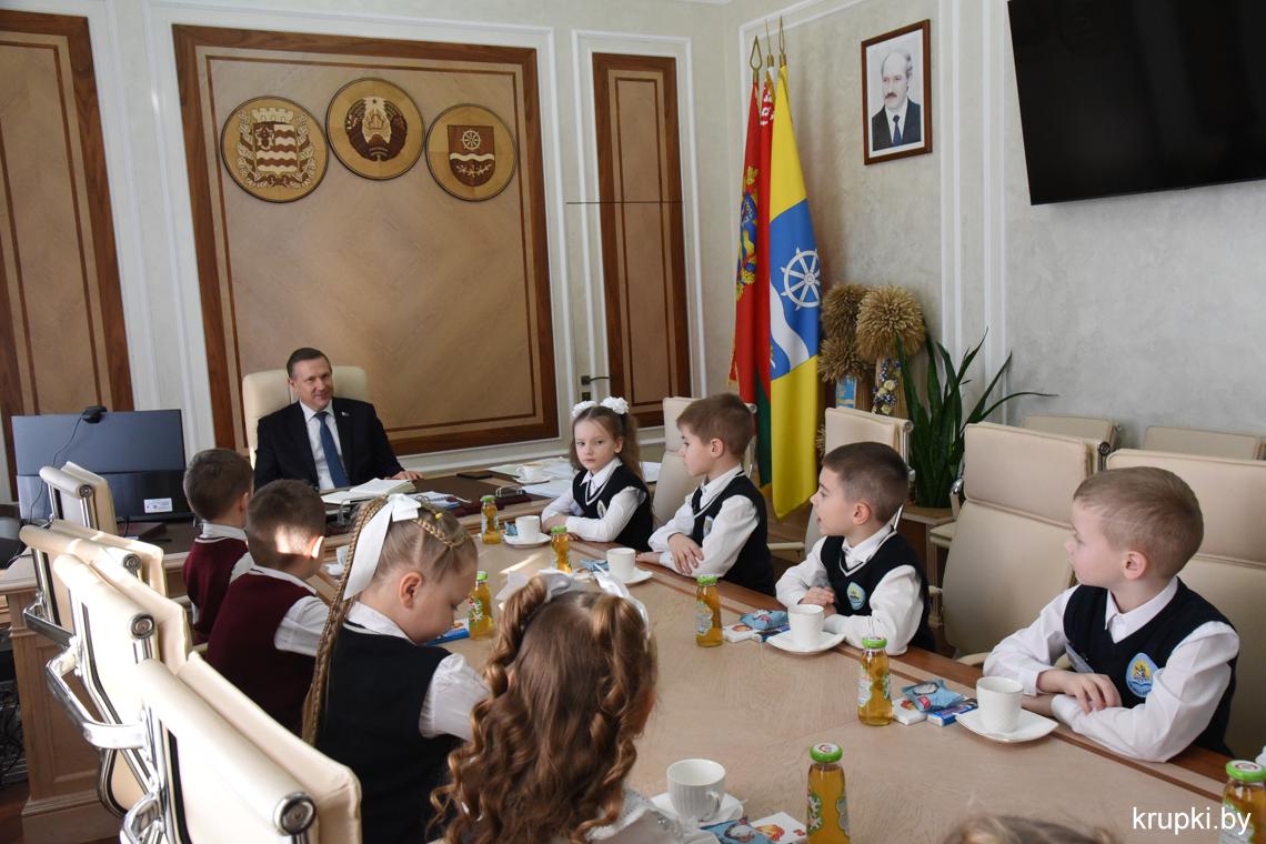 С важным видом, под стать обстановке, маленькая делегация миновала пропускной пункт и проследовала на второй этаж. В кабинете юных гостей уже ждал радушный прием председателя райисполкома Вячеслава Лопатко. Он пообщался с каждым. Дети с радостью делились подробностями: что изучают на уроках, в каких спортивных секциях тренируются и чем увлекаются.