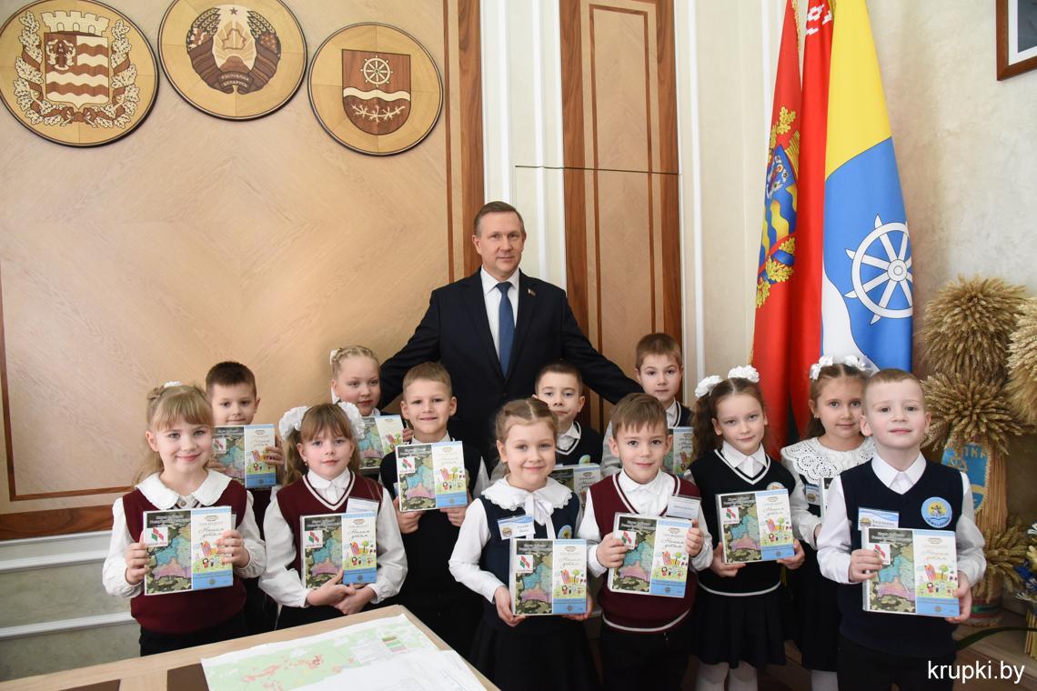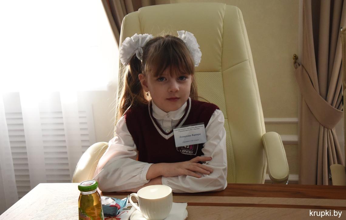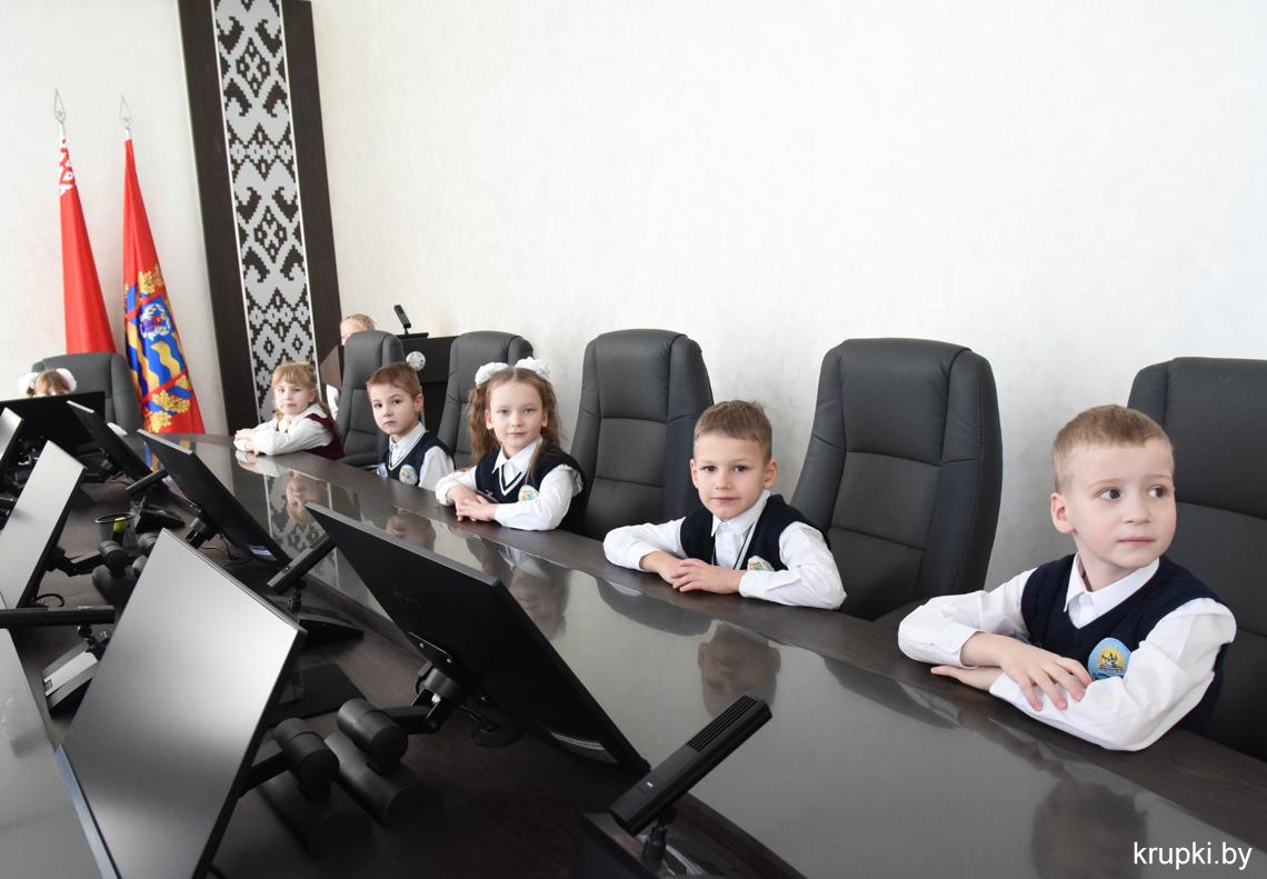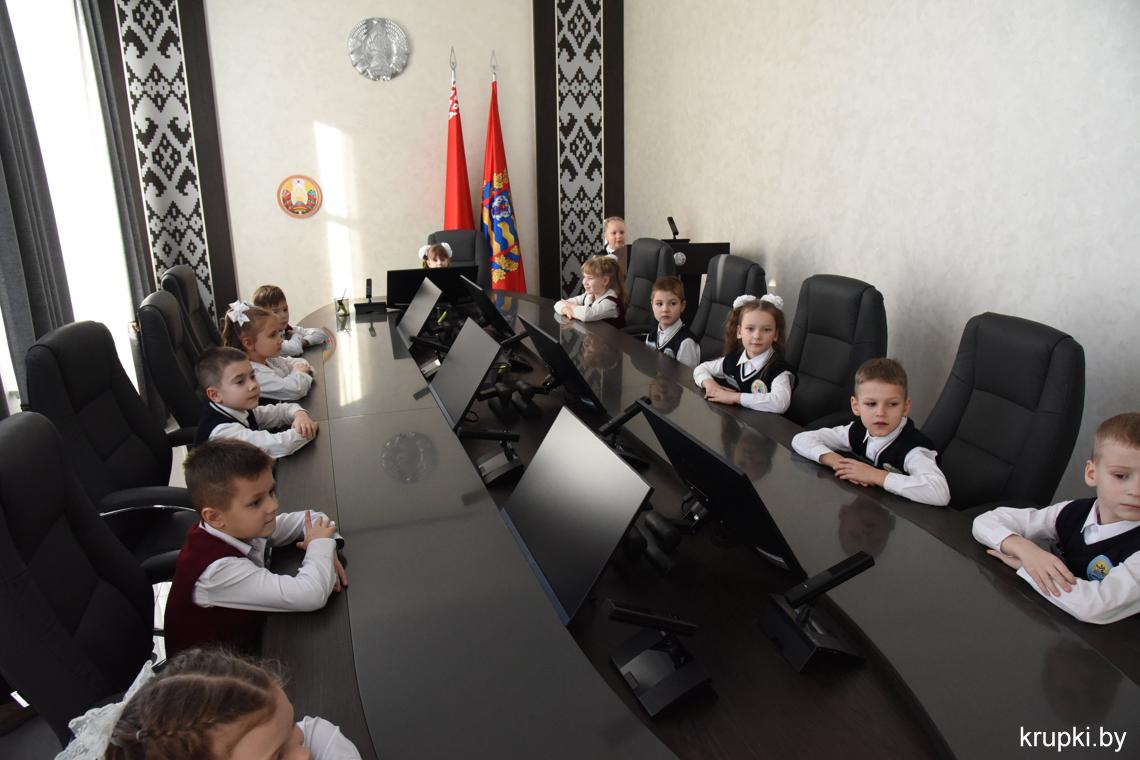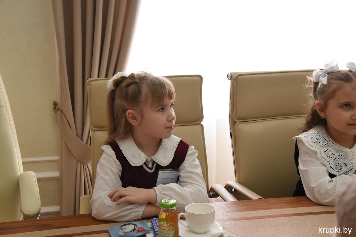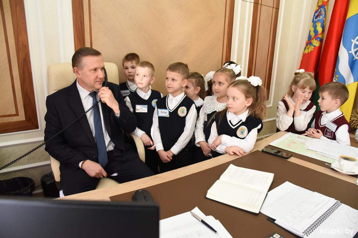С важным видом, под стать обстановке, маленькая делегация миновала пропускной пункт и проследовала на второй этаж. В кабинете юных гостей уже ждал радушный прием председателя райисполкома Вячеслава Лопатко. Он пообщался с каждым. Дети с радостью делились подробностями: что изучают на уроках, в каких спортивных секциях тренируются и чем увлекаются.