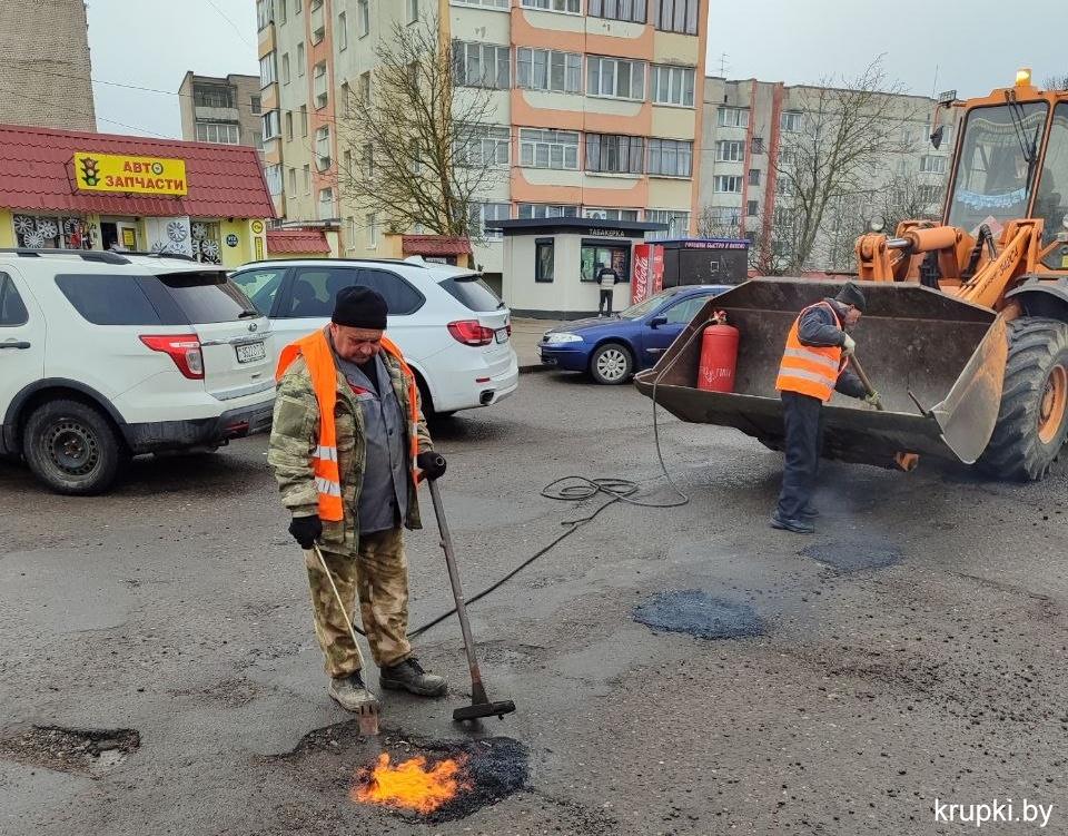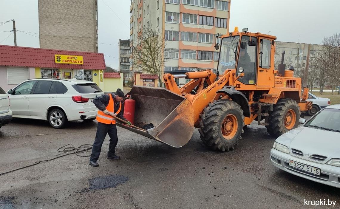 Работники «Жилтеплостроя» производят ямочный ремонт на стоянке у магазина «Евроопт Market» по ул. Московской.