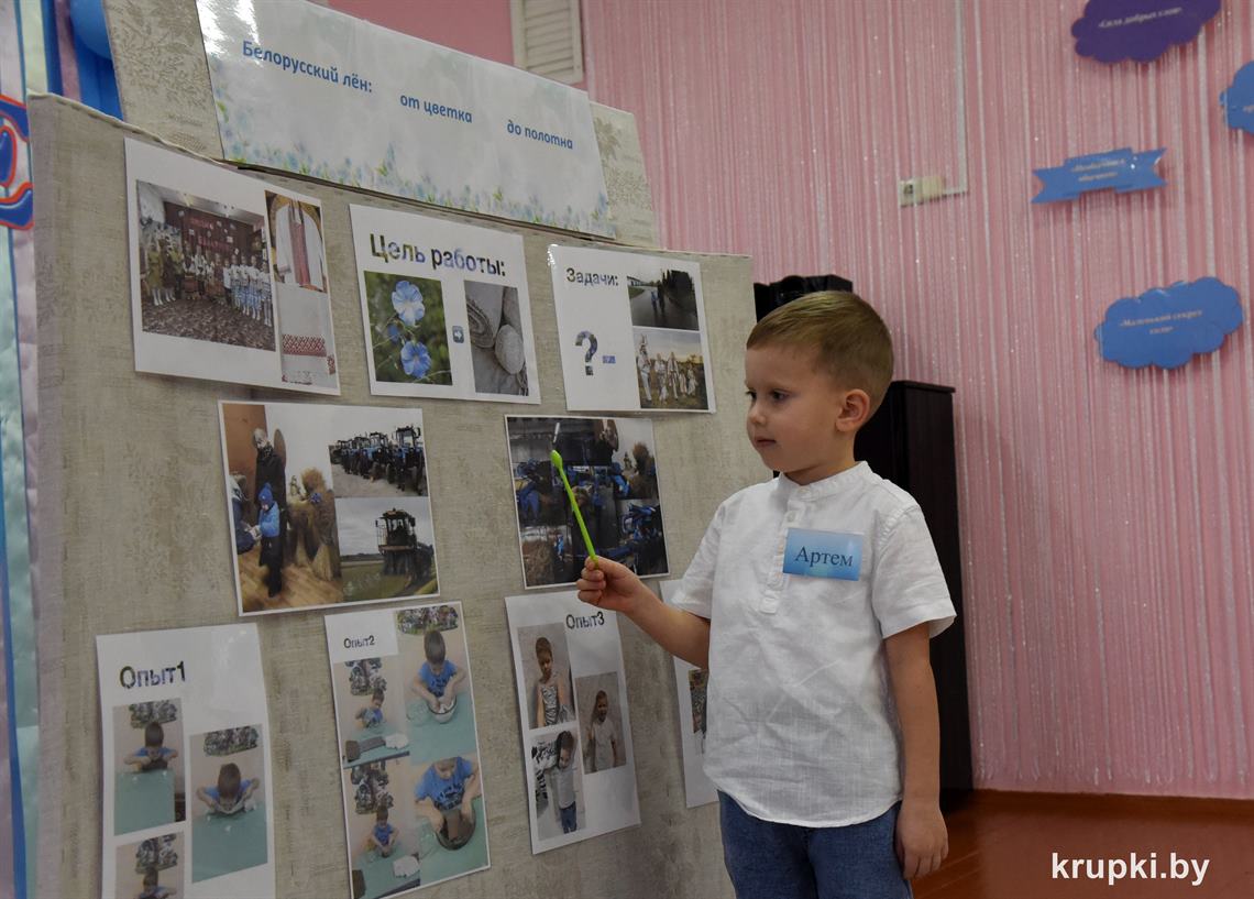 Артем Братулин из Крупского поселкового детского сада поделился своими наблюдениями за белорусским льном, а Павел Реут из Льнозаводского детского сада проверил силу добрых слов.