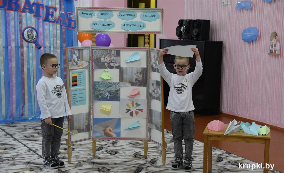 Евгения Авхимович приехала на конкурс из Ухвалы. Она поделилась исследованием о Кока-коле и ее воздействием на организм человека. Братья Марк и Захар Гайдуки, воспитанники детского сада № 1 г. Крупки, рассказали, почему один бумажный самолет летит далеко, а другой нет.