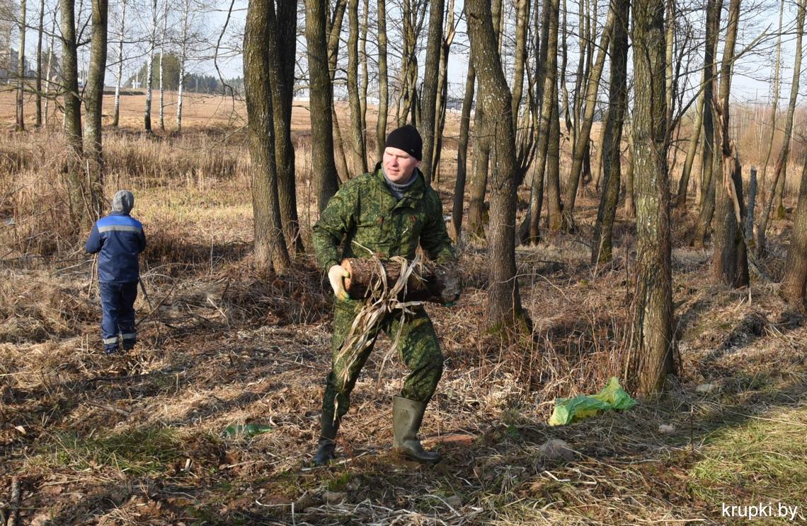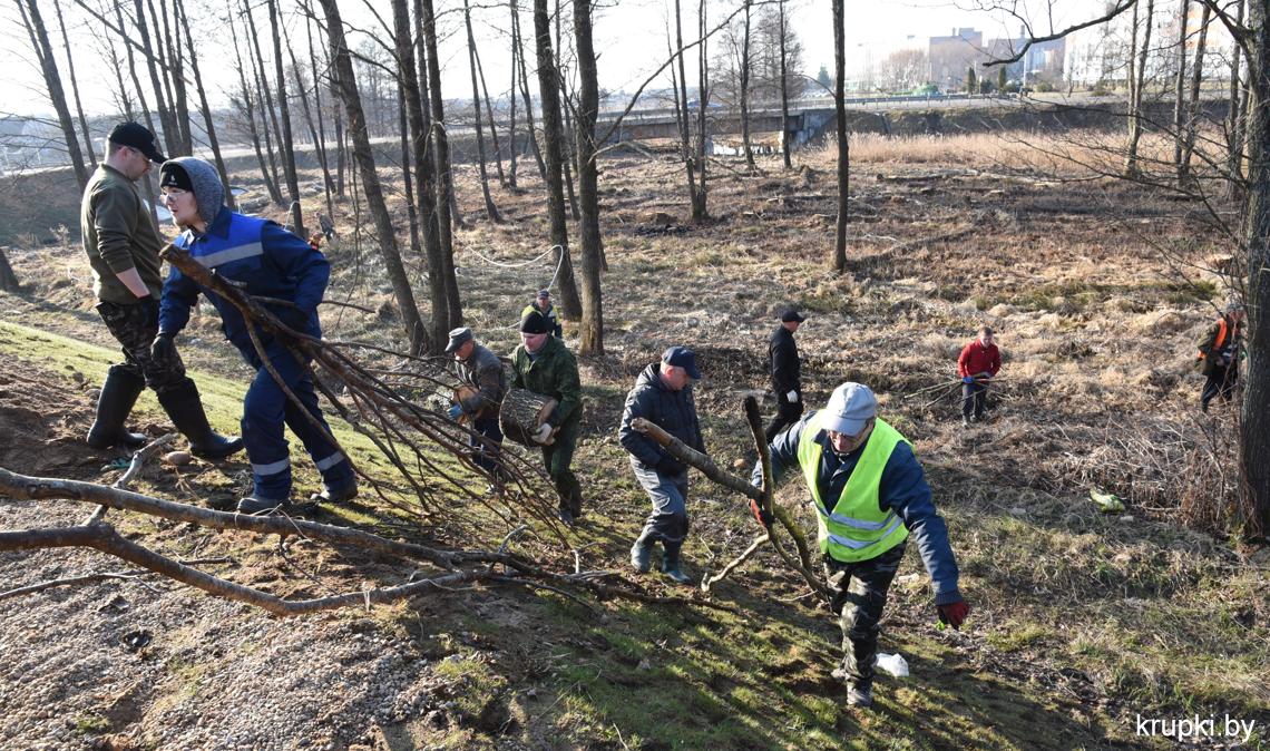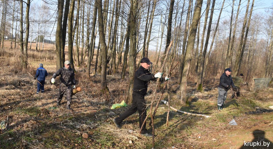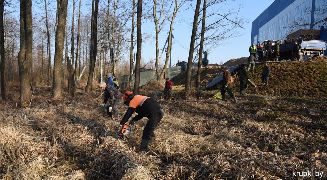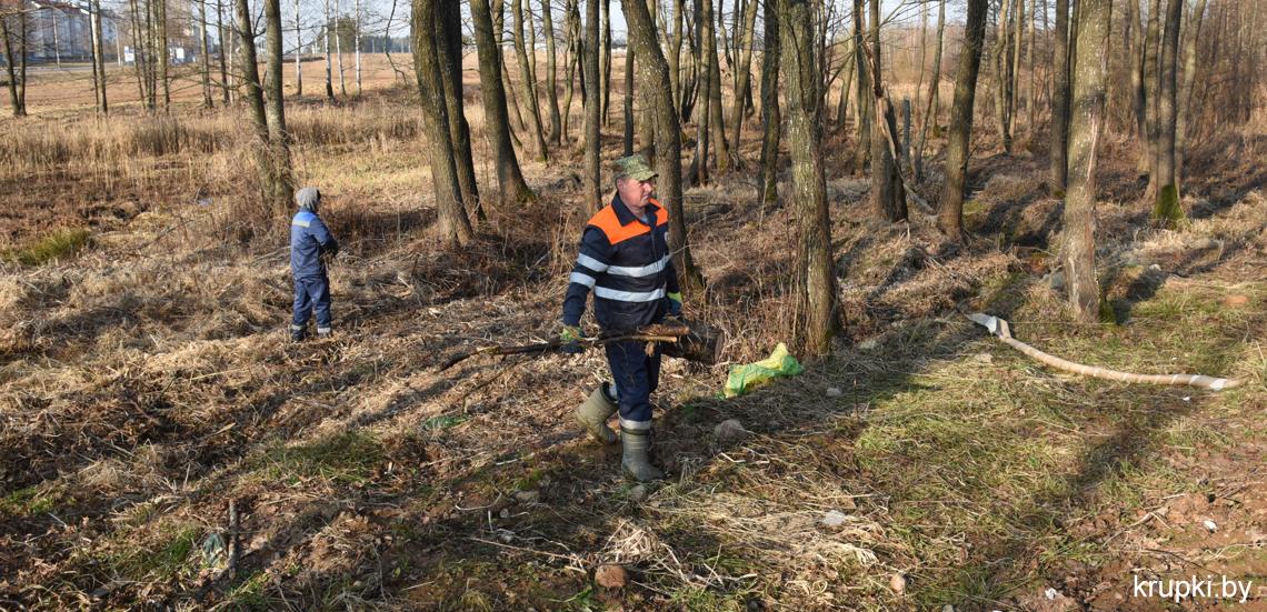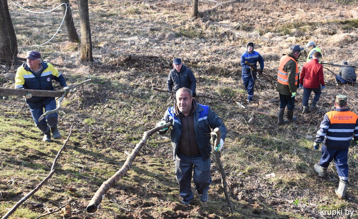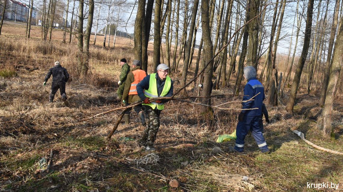 Дружно и слаженно на территории строящегося физкультурно-оздоровительного комплекса трудятся работники райисполкома, Крупского лесхоза, ДРСУ-164 и КУП «Жилтеплострой». Мужская часть большой команды занята на ответственном участке: ведется распил ветровальных деревьев, уборка бревен и порубочных остатков, погрузка в прицеп. Женщины, наведя порядок по периметру, активно включились в общее дело и теперь помогают собирать и складировать ветки - работа спорится на каждом участке.