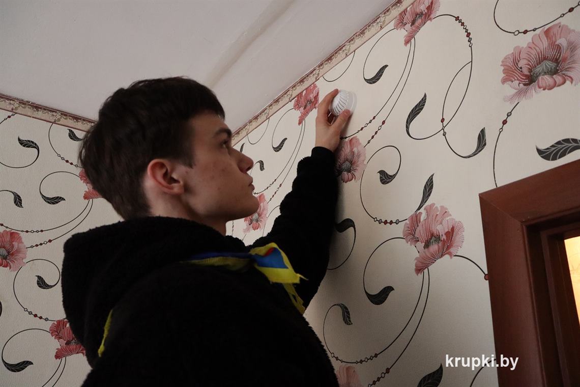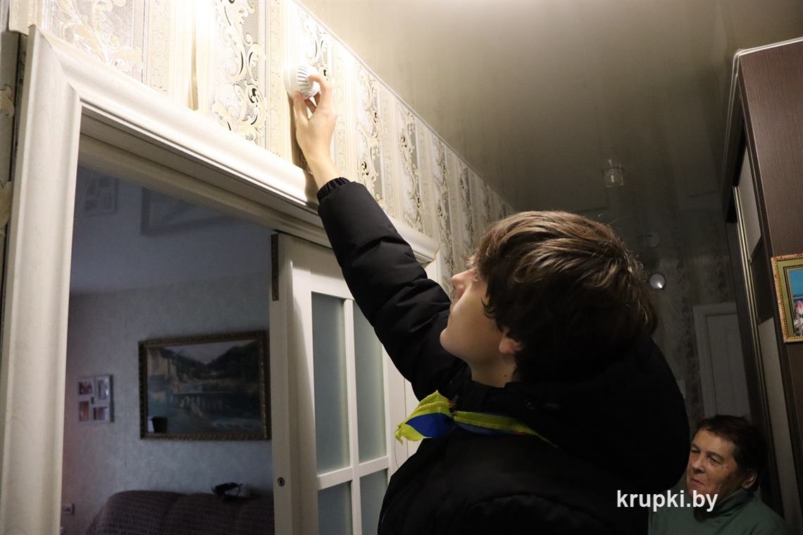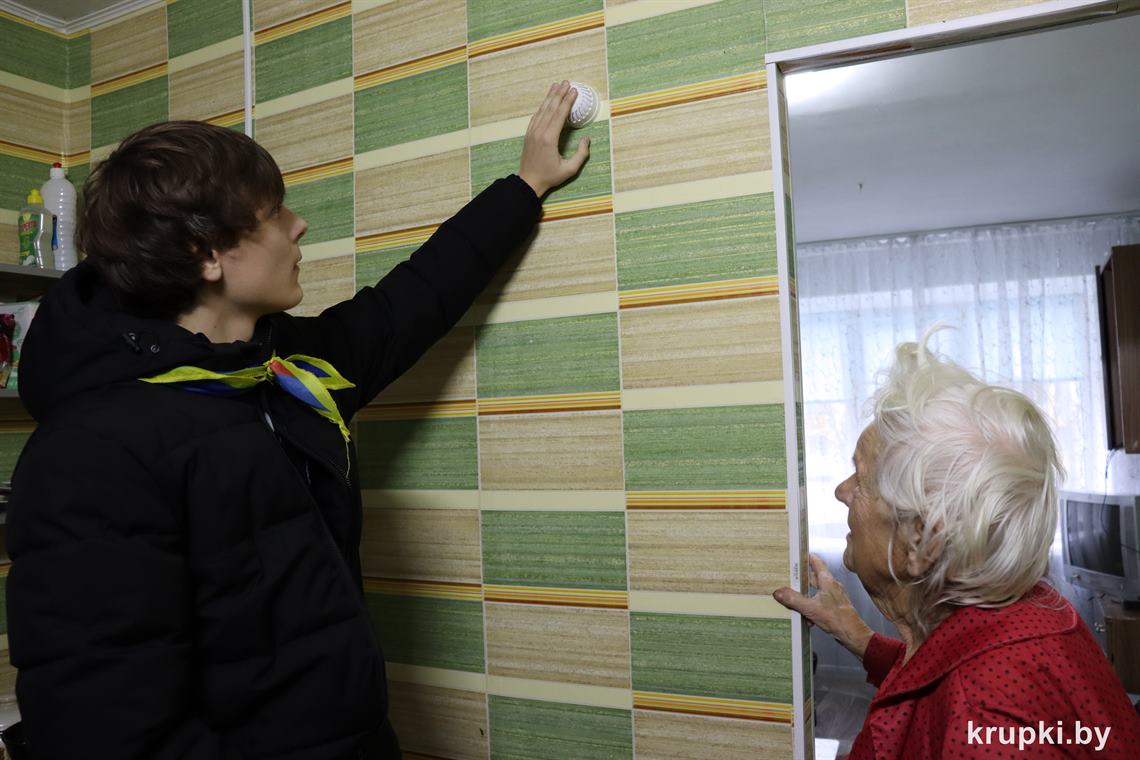 – Это небольшое устройство помогает обнаружить дым на самой ранней стадии возгорания и подаст пронзительный звуковой сигнал, – разъясняет пожилой женщине роль пожарного извещателя Максим Гончаров, активист клуба юных спасателей средней школа № 1 г. Крупки.