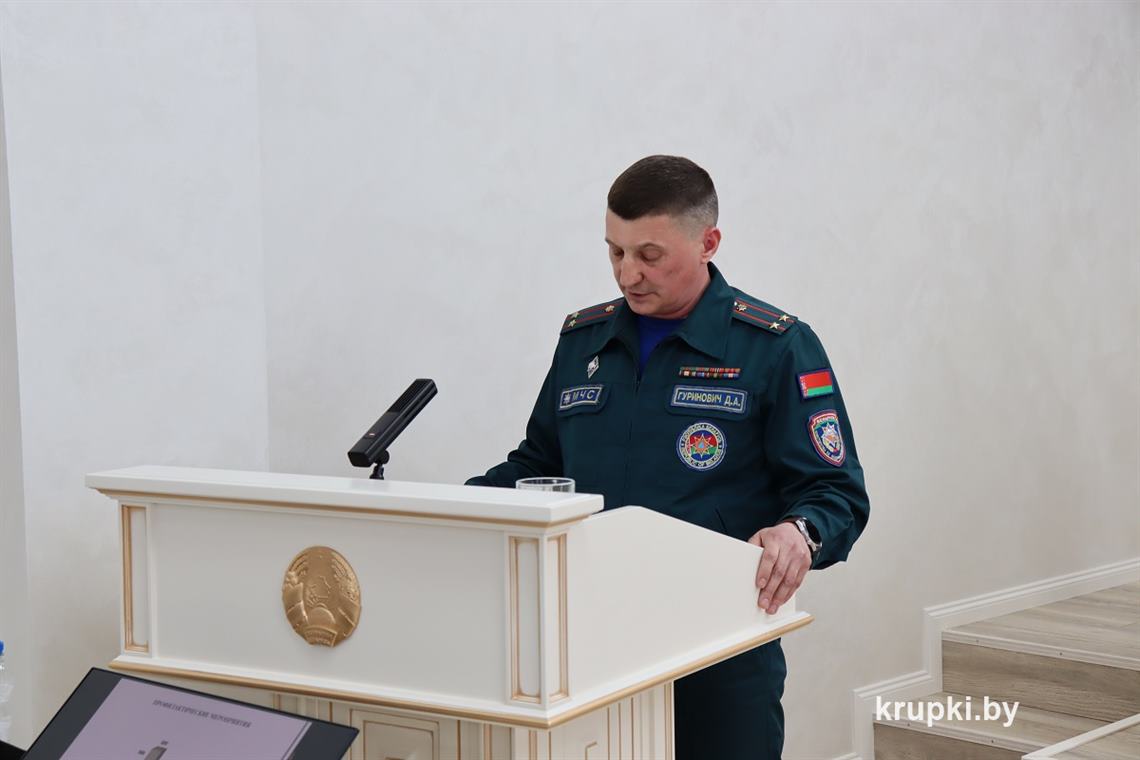 С основным докладом выступил начальник Крупского райотдела по чрезвычайным ситуациям Дмитрий Гуринович, который доложил присутствующим о сложившейся оперативной обстановке, основных причинах возникновения пожаров, а также озвучил проблемные вопросы.