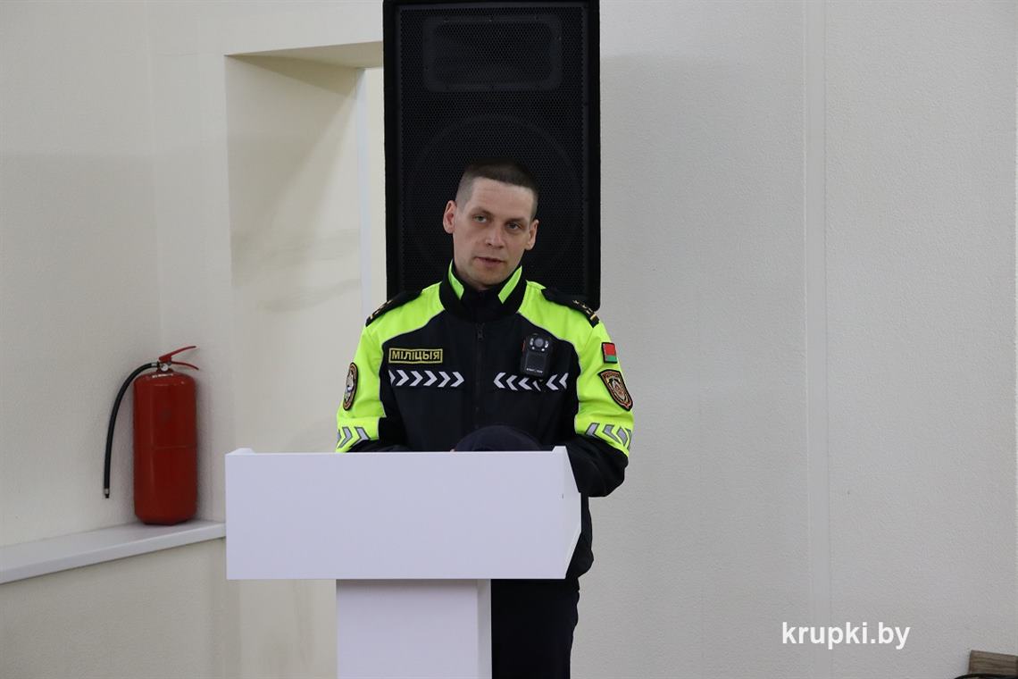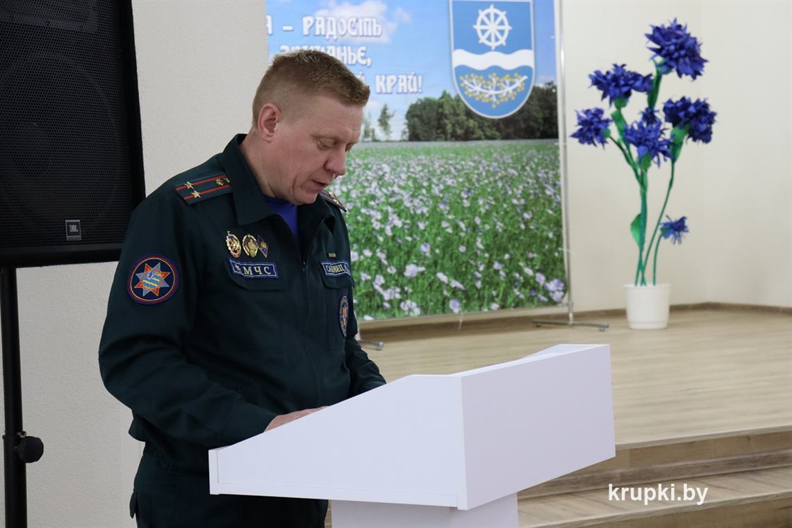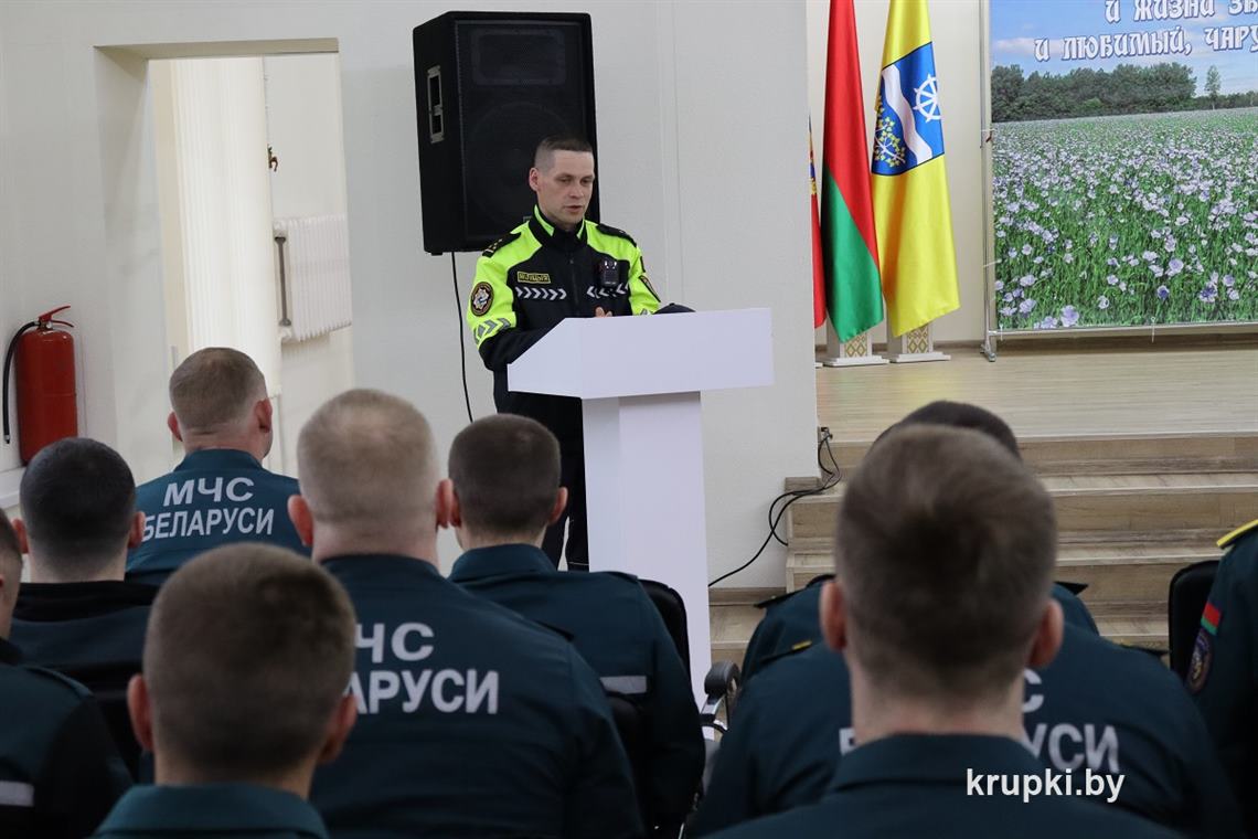 В начале мероприятия начальник Крупского райотдела по ЧС Дмитрий Гуринович довел повестку и представил гостей. В числе приглашенных – главный специалист отдела идеологической работы и по делам молодежи Крупского райисполкома Елена Сорокина и сотрудник межрайонного отдела Госавтоинспекции Борисовского районного управления внутренних дел.